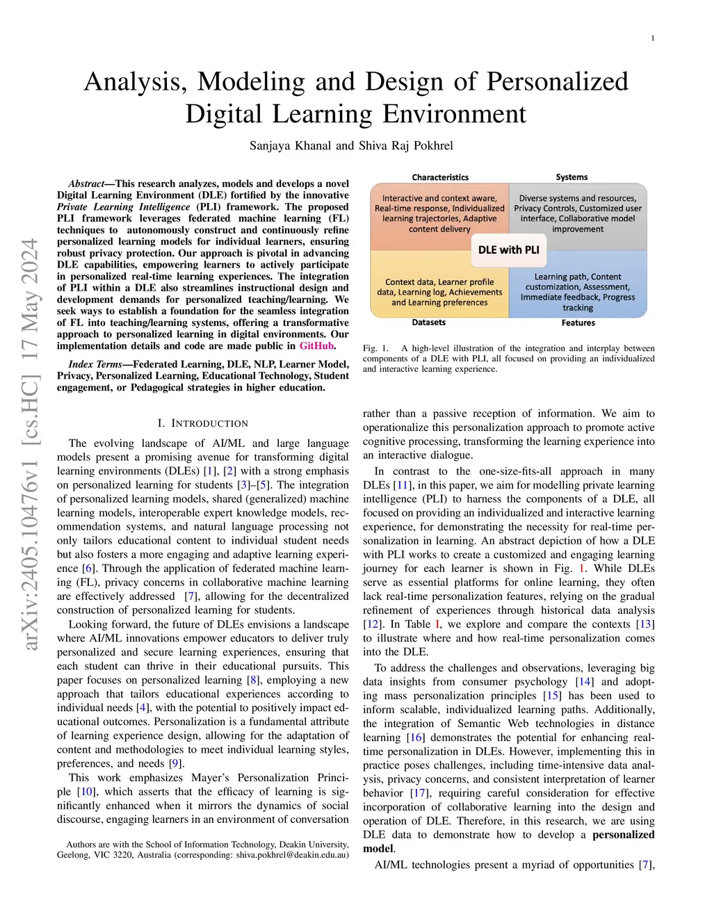 This research analyzes, models and develops a novel Digital Learning Environment (DLE) fortified by the innovative Private Learning Intelligence (PLI) framework. The proposed PLI framework leverages federated machine learning (FL) techniques to autonomously construct and continuously refine personalized learning models for individual learners, ensuring robust privacy protection. Our approach is pivotal in advancing DLE capabilities, empowering learners to actively participate in personalized real-time learning experiences. The integration of PLI within a DLE also streamlines instructional design and development demands for personalized teaching/learning. We seek ways to establish a foundation for the seamless integration of FL into learning systems, offering a transformative approach to personalized learning in digital environments. Our implementation details and code are made public.