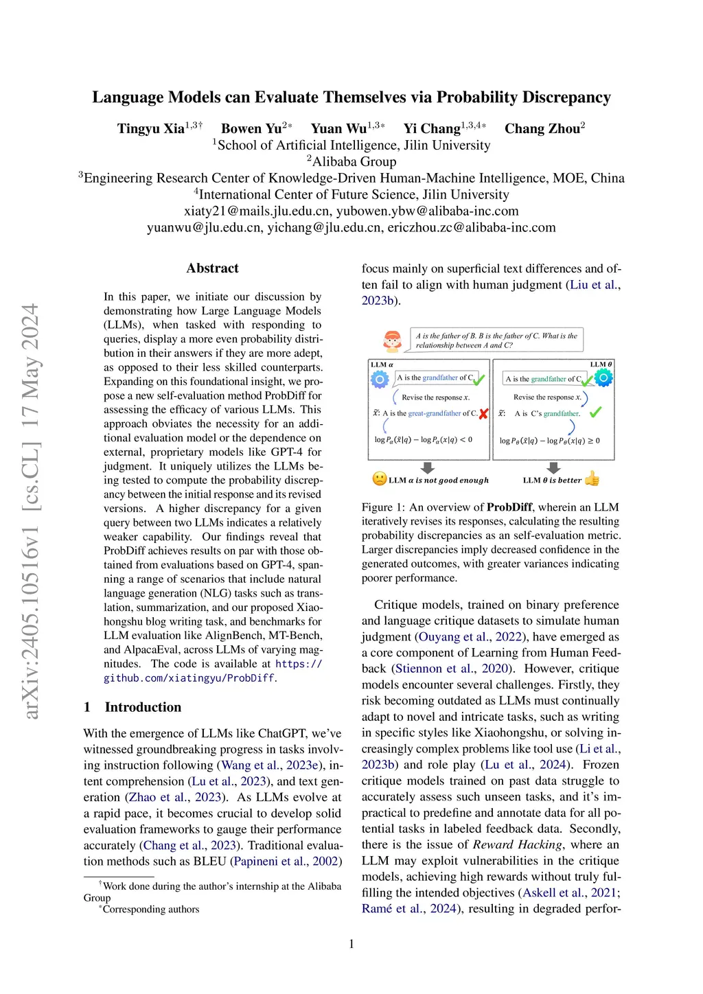 In this paper, we initiate our discussion by demonstrating how Large Language Models (LLMs), when tasked with responding to queries, display a more even probability distribution in their answers if they are more adept, as opposed to their less skilled counterparts. Expanding on this foundational insight, we propose a new self-evaluation method ProbDiff for assessing the efficacy of various LLMs. This approach obviates the necessity for an additional evaluation model or the dependence on external, proprietary models like GPT-4 for judgment. It uniquely utilizes the LLMs being tested to compute the probability discrepancy between the initial response and its revised versions. A higher discrepancy for a given query between two LLMs indicates a relatively weaker capability. Our findings reveal that ProbDiff achieves results on par with those obtained from evaluations based on GPT-4, spanning a range of scenarios that include natural language generation (NLG) tasks such as translation, summarization, and our proposed Xiaohongshu blog writing task, and benchmarks for LLM evaluation like AlignBench, MT-Bench, and AlpacaEval, across LLMs of varying magnitudes.