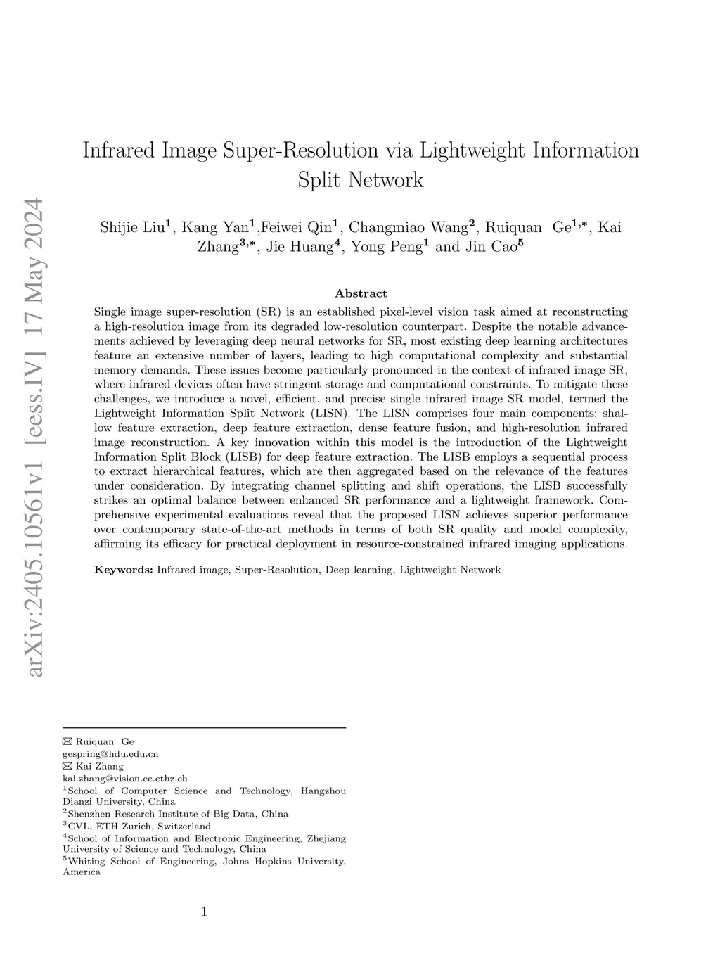 Single image super-resolution (SR) is an established pixel-level vision task aimed at reconstructing a high-resolution image from its degraded low-resolution counterpart. Despite the notable advancements achieved by leveraging deep neural networks for SR, most existing deep learning architectures feature an extensive number of layers, leading to high computational complexity and substantial memory demands. These issues become particularly pronounced in the context of infrared image SR, where infrared devices often have stringent storage and computational constraints. To mitigate these challenges, we introduce a novel, efficient, and precise single infrared image SR model, termed the Lightweight Information Split Network (LISN). The LISN comprises four main components: shallow feature extraction, deep feature extraction, dense feature fusion, and high-resolution infrared image reconstruction. A key innovation within this model is the introduction of the Lightweight Information Split Block (LISB) for deep feature extraction. The LISB employs a sequential process to extract hierarchical features, which are then aggregated based on the relevance of the features under consideration. By integrating channel splitting and shift operations, the LISB successfully strikes an optimal balance between enhanced SR performance and a lightweight framework. Comprehensive experimental evaluations reveal that the proposed LISN achieves superior performance over contemporary state-of-the-art methods in terms of both SR quality and model complexity, affirming its efficacy for practical deployment in resource-constrained infrared imaging applications.