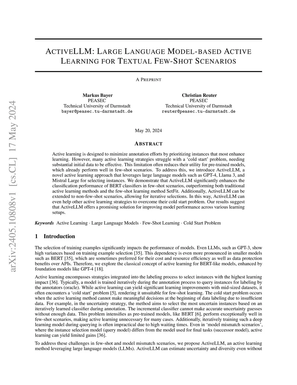 Active learning is designed to minimize annotation efforts by prioritizing instances that most enhance learning. However, many active learning strategies struggle with a `cold-start' problem, needing substantial initial data to be effective. This limitation reduces their utility in the increasingly relevant few-shot scenarios, where the instance selection has a substantial impact. To address this, we introduce ActiveLLM, a novel active learning approach that leverages Large Language Models such as GPT-4, o1, Llama 3, or Mistral Large for selecting instances. We demonstrate that ActiveLLM significantly enhances the classification performance of BERT classifiers in few-shot scenarios, outperforming traditional active learning methods as well as improving the few-shot learning methods ADAPET, PERFECT, and SetFit. Additionally, ActiveLLM can be extended to non-few-shot scenarios, allowing for iterative selections. In this way, ActiveLLM can even help other active learning strategies to overcome their cold-start problem. Our results suggest that ActiveLLM offers a promising solution for improving model performance across various learning setups.