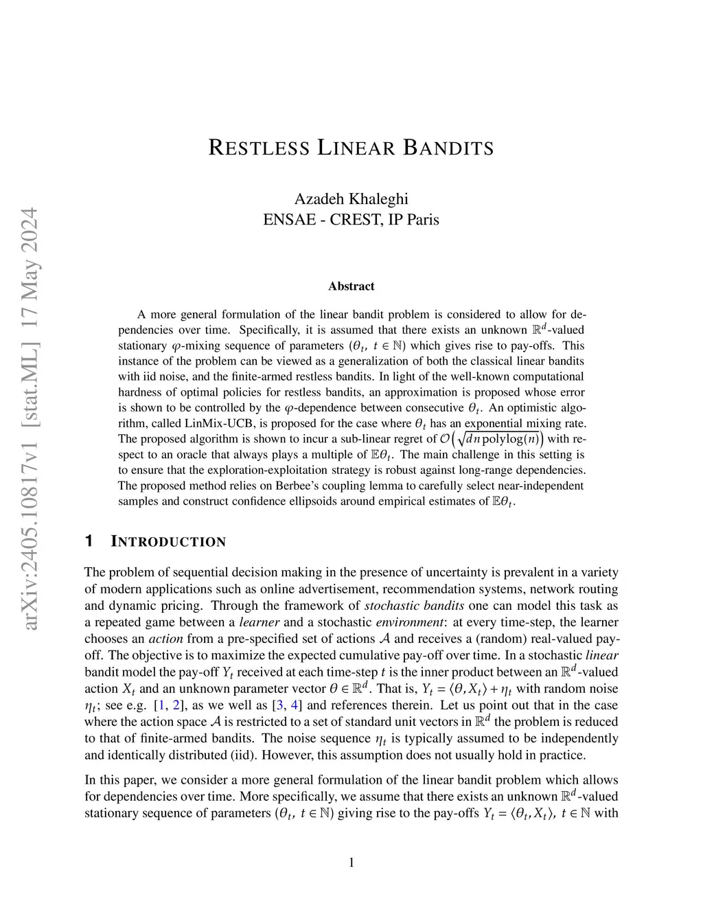 A more general formulation of the linear bandit problem is considered to allow for dependencies over time. Specifically, it is assumed that there exists an unknown -valued stationary -mixing sequence of parameters which gives rise to pay-offs. This instance of the problem can be viewed as a generalization of both the classical linear bandits with iid noise, and the finite-armed restless bandits. In light of the well-known computational hardness of optimal policies for restless bandits, an approximation is proposed whose error is shown to be controlled by the -dependence between consecutive . An optimistic algorithm, called LinMix-UCB, is proposed for the case where has an exponential mixing rate. The proposed algorithm is shown to incur a sub-linear regret of with respect to an oracle that always plays a multiple of . The main challenge in this setting is to ensure that the exploration-exploitation strategy is robust against long-range dependencies. The proposed method relies on Berbee's coupling lemma to carefully select near-independent samples and construct confidence ellipsoids around empirical estimates of .