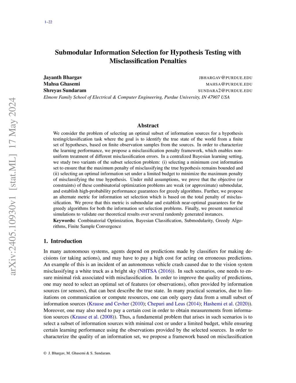 We consider the problem of selecting an optimal subset of information sources for a hypothesis testing/classification task where the goal is to identify the true state of the world from a finite set of hypotheses, based on finite observation samples from the sources. In order to characterize the learning performance, we propose a misclassification penalty framework, which enables nonuniform treatment of different misclassification errors. In a centralized Bayesian learning setting, we study two variants of the subset selection problem: (i) selecting a minimum cost information set to ensure that the maximum penalty of misclassifying the true hypothesis is below a desired bound and (ii) selecting an optimal information set under a limited budget to minimize the maximum penalty of misclassifying the true hypothesis. Under certain assumptions, we prove that the objective (or constraints) of these combinatorial optimization problems are weak (or approximate) submodular, and establish high-probability performance guarantees for greedy algorithms. Further, we propose an alternate metric for information set selection which is based on the total penalty of misclassification. We prove that this metric is submodular and establish near-optimal guarantees for the greedy algorithms for both the information set selection problems. Finally, we present numerical simulations to validate our theoretical results over several randomly generated instances.