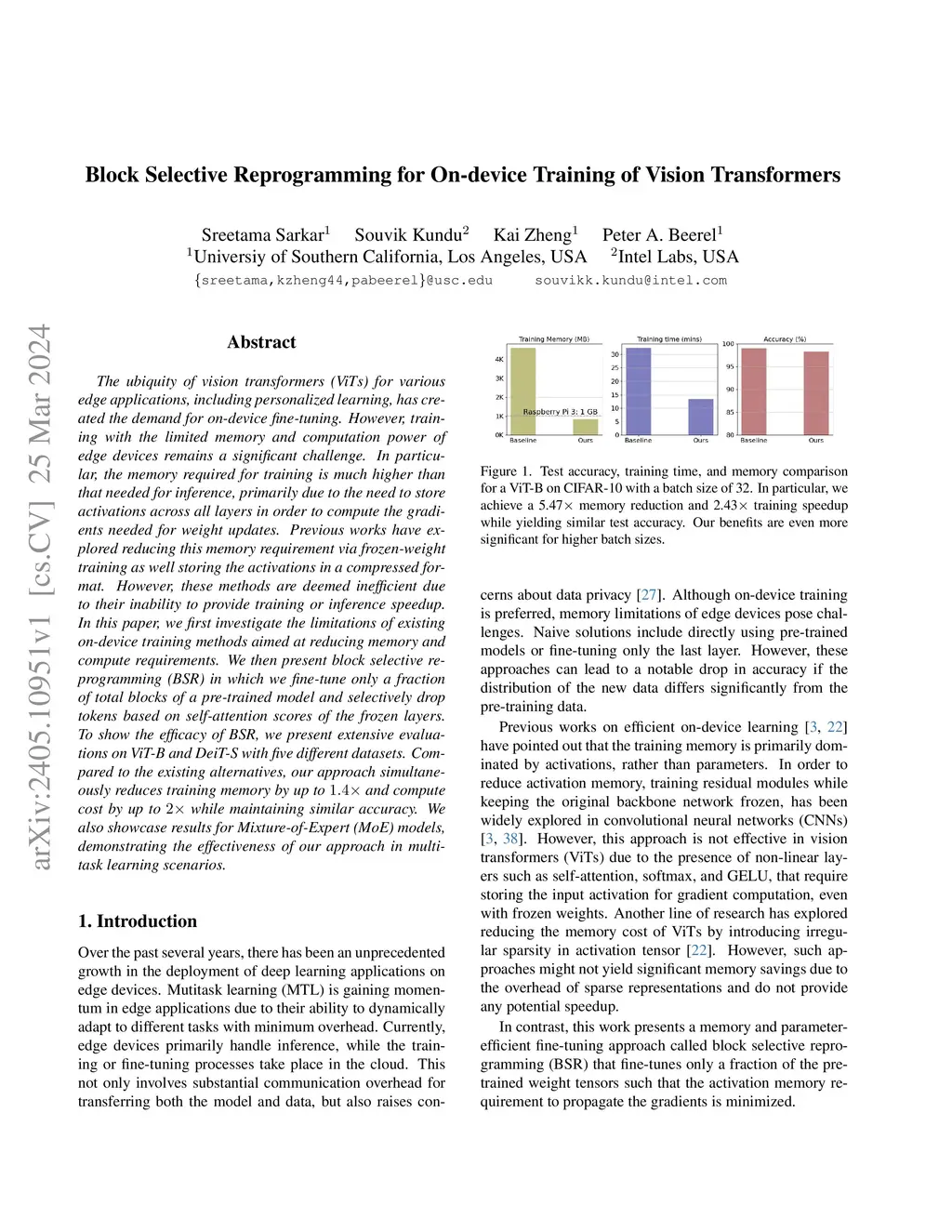 The ubiquity of vision transformers (ViTs) for various edge applications, including personalized learning, has created the demand for on-device fine-tuning. However, training with the limited memory and computation power of edge devices remains a significant challenge. In particular, the memory required for training is much higher than that needed for inference, primarily due to the need to store activations across all layers in order to compute the gradients needed for weight updates. Previous works have explored reducing this memory requirement via frozen-weight training as well storing the activations in a compressed format. However, these methods are deemed inefficient due to their inability to provide training or inference speedup. In this paper, we first investigate the limitations of existing on-device training methods aimed at reducing memory and compute requirements. We then present block selective reprogramming (BSR) in which we fine-tune only a fraction of total blocks of a pre-trained model and selectively drop tokens based on self-attention scores of the frozen layers. To show the efficacy of BSR, we present extensive evaluations on ViT-B and DeiT-S with five different datasets. Compared to the existing alternatives, our approach simultaneously reduces training memory by up to 1.4x and compute cost by up to 2x while maintaining similar accuracy. We also showcase results for Mixture-of-Expert (MoE) models, demonstrating the effectiveness of our approach in multitask learning scenarios.