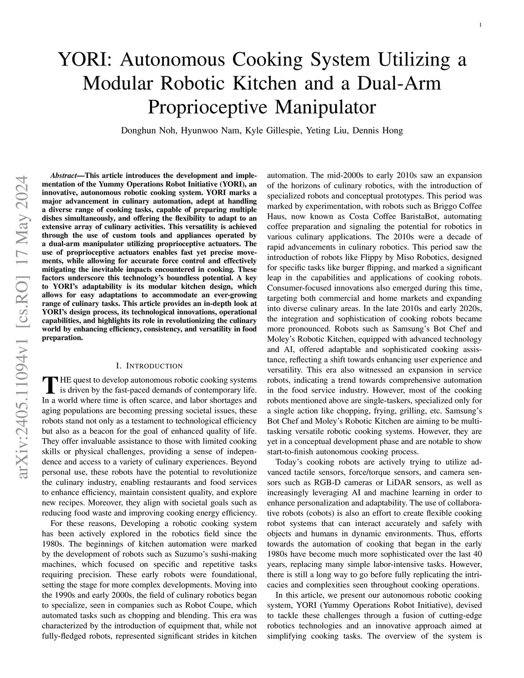 Yummy Operations Robot Initiative: Autonomous Cooking System Utilizing a Modular Robotic Kitchen and a Dual-Arm Proprioceptive Manipulator