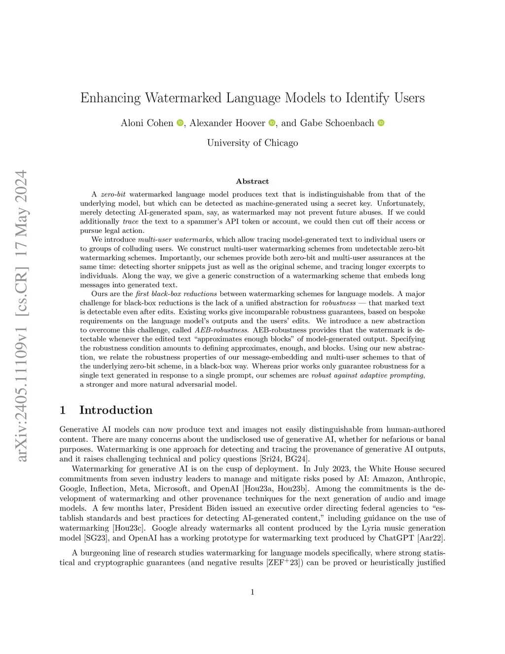 We study watermarking schemes for language models with provable guarantees. As we show, prior works offer no robustness guarantees against adaptive prompting: when a user queries a language model more than once, as even benign users do. And with just a single exception (Christ and Gunn, 2024), prior works are restricted to zero-bit watermarking: machine-generated text can be detected as such, but no additional information can be extracted from the watermark. Unfortunately, merely detecting AI-generated text may not prevent future abuses. We introduce multi-user watermarks, which allow tracing model-generated text to individual users or to groups of colluding users, even in the face of adaptive prompting. We construct multi-user watermarking schemes from undetectable, adaptively robust, zero-bit watermarking schemes (and prove that the undetectable zero-bit scheme of Christ, Gunn, and Zamir (2024) is adaptively robust). Importantly, our scheme provides both zero-bit and multi-user assurances at the same time. It detects shorter snippets just as well as the original scheme, and traces longer excerpts to individuals. The main technical component is a construction of message-embedding watermarks from zero-bit watermarks. Ours is the first generic reduction between watermarking schemes for language models. A challenge for such reductions is the lack of a unified abstraction for robustness -- that marked text is detectable even after edits. We introduce a new unifying abstraction called AEB-robustness. AEB-robustness provides that the watermark is detectable whenever the edited text "approximates enough blocks" of model-generated output.