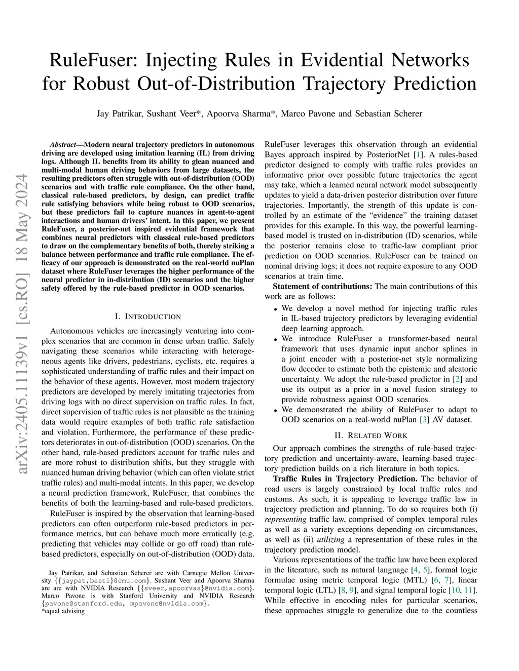 Modern neural trajectory predictors in autonomous driving are developed using imitation learning (IL) from driving logs. Although IL benefits from its ability to glean nuanced and multi-modal human driving behaviors from large datasets, the resulting predictors often struggle with out-of-distribution (OOD) scenarios and with traffic rule compliance. On the other hand, classical rule-based predictors, by design, can predict traffic rule satisfying behaviors while being robust to OOD scenarios, but these predictors fail to capture nuances in agent-to-agent interactions and human driver's intent. In this paper, we present RuleFuser, a posterior-net inspired evidential framework that combines neural predictors with classical rule-based predictors to draw on the complementary benefits of both, thereby striking a balance between performance and traffic rule compliance. The efficacy of our approach is demonstrated on the real-world nuPlan dataset where RuleFuser leverages the higher performance of the neural predictor in in-distribution (ID) scenarios and the higher safety offered by the rule-based predictor in OOD scenarios.