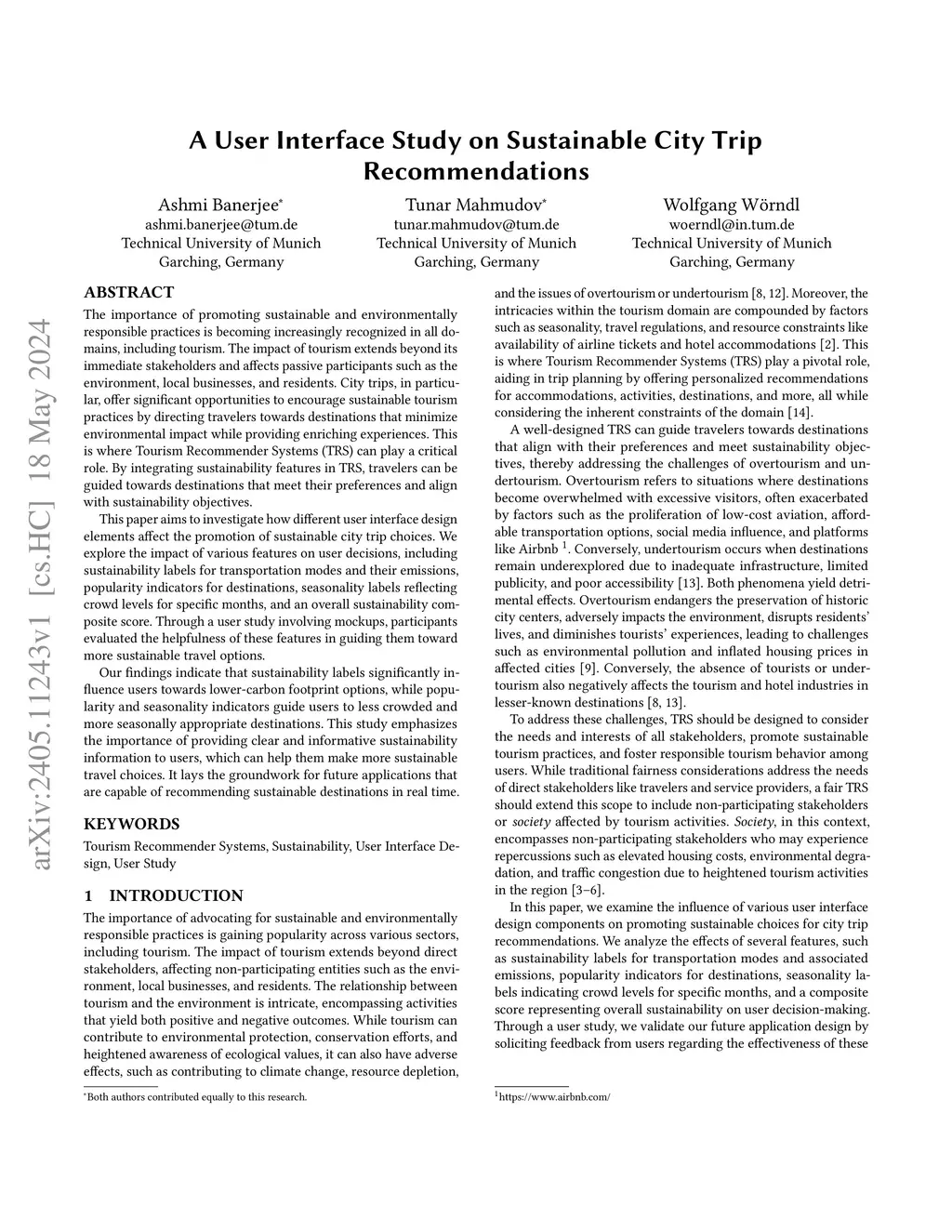 The importance of promoting sustainable and environmentally responsible practices is becoming increasingly recognized in all domains, including tourism. The impact of tourism extends beyond its immediate stakeholders and affects passive participants such as the environment, local businesses, and residents. City trips, in particular, offer significant opportunities to encourage sustainable tourism practices by directing travelers towards destinations that minimize environmental impact while providing enriching experiences. Tourism Recommender Systems (TRS) can play a critical role in this. By integrating sustainability features in TRS, travelers can be guided towards destinations that meet their preferences and align with sustainability objectives. This paper investigates how different user interface design elements affect the promotion of sustainable city trip choices. We explore the impact of various features on user decisions, including sustainability labels for transportation modes and their emissions, popularity indicators for destinations, seasonality labels reflecting crowd levels for specific months, and an overall sustainability composite score. Through a user study involving mockups, participants evaluated the helpfulness of these features in guiding them toward more sustainable travel options. Our findings indicate that sustainability labels significantly influence users towards lower-carbon footprint options, while popularity and seasonality indicators guide users to less crowded and more seasonally appropriate destinations. This study emphasizes the importance of providing users with clear and informative sustainability information, which can help them make more sustainable travel choices. It lays the groundwork for future applications that can recommend sustainable destinations in real-time.