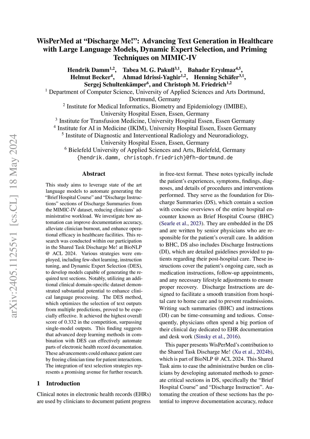 This study aims to leverage state of the art language models to automate generating the "Brief Hospital Course" and "Discharge Instructions" sections of Discharge Summaries from the MIMIC-IV dataset, reducing clinicians' administrative workload. We investigate how automation can improve documentation accuracy, alleviate clinician burnout, and enhance operational efficacy in healthcare facilities. This research was conducted within our participation in the Shared Task Discharge Me! at BioNLP @ ACL 2024. Various strategies were employed, including few-shot learning, instruction tuning, and Dynamic Expert Selection (DES), to develop models capable of generating the required text sections. Notably, utilizing an additional clinical domain-specific dataset demonstrated substantial potential to enhance clinical language processing. The DES method, which optimizes the selection of text outputs from multiple predictions, proved to be especially effective. It achieved the highest overall score of 0.332 in the competition, surpassing single-model outputs. This finding suggests that advanced deep learning methods in combination with DES can effectively automate parts of electronic health record documentation. These advancements could enhance patient care by freeing clinician time for patient interactions. The integration of text selection strategies represents a promising avenue for further research.