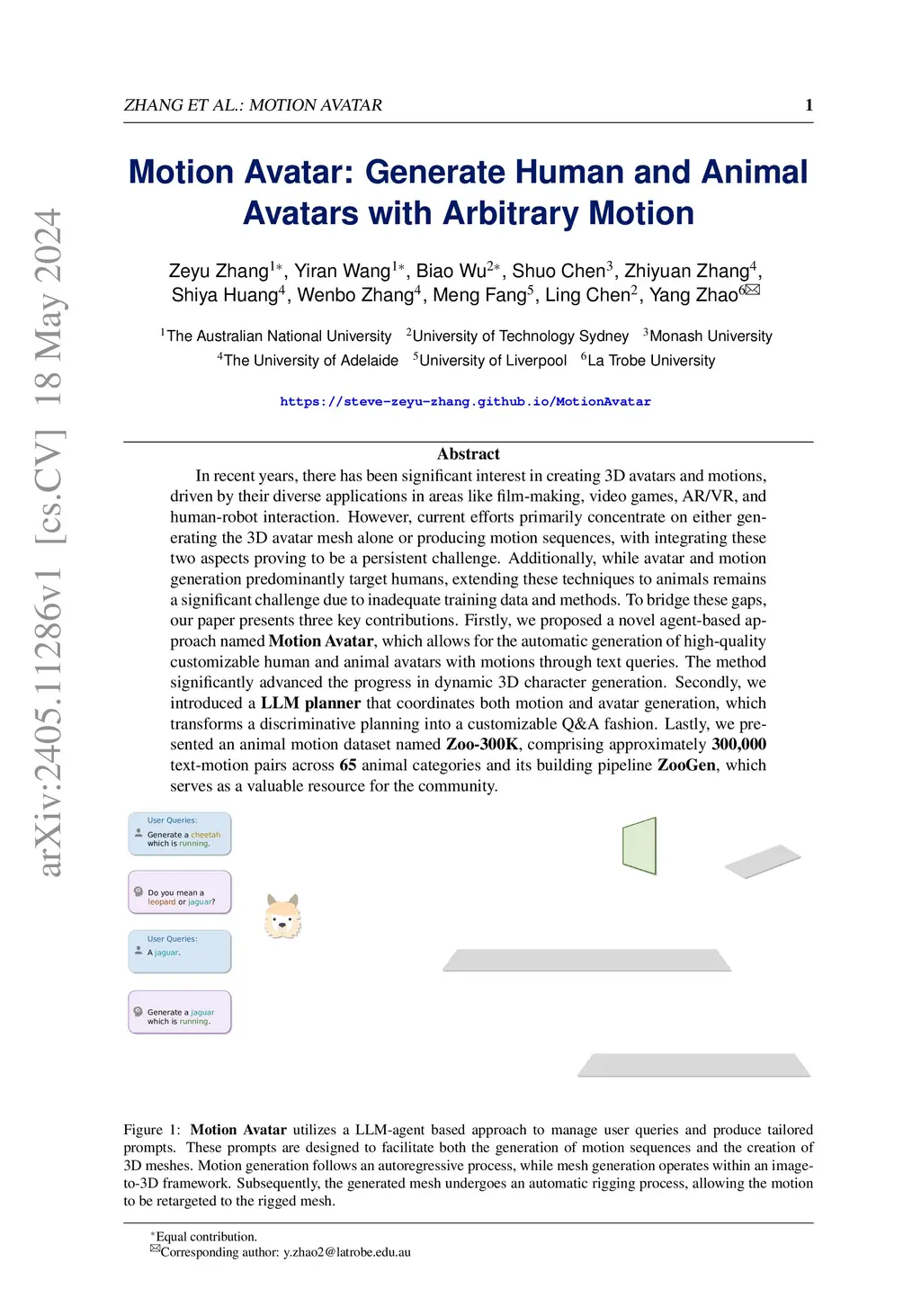 In recent years, there has been significant interest in creating 3D avatars and motions, driven by their diverse applications in areas like film-making, video games, AR/VR, and human-robot interaction. However, current efforts primarily concentrate on either generating the 3D avatar mesh alone or producing motion sequences, with integrating these two aspects proving to be a persistent challenge. Additionally, while avatar and motion generation predominantly target humans, extending these techniques to animals remains a significant challenge due to inadequate training data and methods. To bridge these gaps, our paper presents three key contributions. Firstly, we proposed a novel agent-based approach named Motion Avatar, which allows for the automatic generation of high-quality customizable human and animal avatars with motions through text queries. The method significantly advanced the progress in dynamic 3D character generation. Secondly, we introduced a LLM planner that coordinates both motion and avatar generation, which transforms a discriminative planning into a customizable Q&A fashion. Lastly, we presented an animal motion dataset named Zoo-300K, comprising approximately 300,000 text-motion pairs across 65 animal categories and its building pipeline ZooGen, which serves as a valuable resource for the community. See project website https://steve-zeyu-zhang.github.io/MotionAvatar/