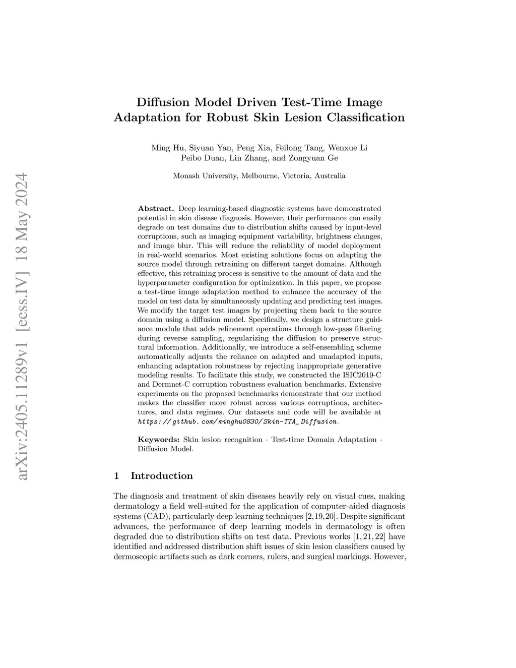 Diffusion Model Driven Test-Time Image Adaptation for Robust Skin Lesion