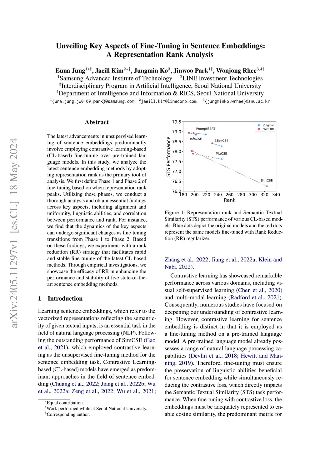 The latest advancements in unsupervised learning of sentence embeddings predominantly involve employing contrastive learning-based (CL-based) fine-tuning over pre-trained language models. In this study, we analyze the latest sentence embedding methods by adopting representation rank as the primary tool of analysis. We first define Phase 1 and Phase 2 of fine-tuning based on when representation rank peaks. Utilizing these phases, we conduct a thorough analysis and obtain essential findings across key aspects, including alignment and uniformity, linguistic abilities, and correlation between performance and rank. For instance, we find that the dynamics of the key aspects can undergo significant changes as fine-tuning transitions from Phase 1 to Phase 2. Based on these findings, we experiment with a rank reduction (RR) strategy that facilitates rapid and stable fine-tuning of the latest CL-based methods. Through empirical investigations, we showcase the efficacy of RR in enhancing the performance and stability of five state-of-the-art sentence embedding methods.