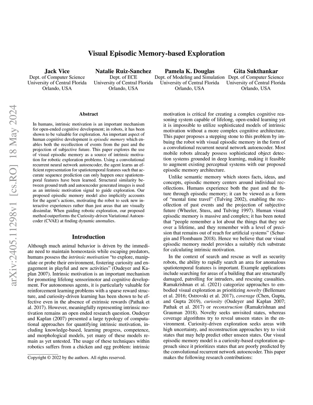 In humans, intrinsic motivation is an important mechanism for open-ended cognitive development; in robots, it has been shown to be valuable for exploration. An important aspect of human cognitive development is which enables both the recollection of events from the past and the projection of subjective future. This paper explores the use of visual episodic memory as a source of intrinsic motivation for robotic exploration problems. Using a convolutional recurrent neural network autoencoder, the agent learns an efficient representation for spatiotemporal features such that accurate sequence prediction can only happen once spatiotemporal features have been learned. Structural similarity between ground truth and autoencoder generated images is used as an intrinsic motivation signal to guide exploration. Our proposed episodic memory model also implicitly accounts for the agent's actions, motivating the robot to seek new interactive experiences rather than just areas that are visually dissimilar. When guiding robotic exploration, our proposed method outperforms the Curiosity-driven Variational Autoencoder (CVAE) at finding dynamic anomalies.