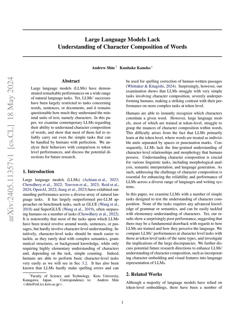 Large language models (LLMs) have demonstrated remarkable performances on a wide range of natural language tasks. Yet, LLMs' successes have been largely restricted to tasks concerning words, sentences, or documents, and it remains questionable how much they understand the minimal units of text, namely characters. In this paper, we examine contemporary LLMs regarding their ability to understand character composition of words, and show that most of them fail to reliably carry out even the simple tasks that can be handled by humans with perfection. We analyze their behaviors with comparison to token level performances, and discuss the potential directions for future research.
