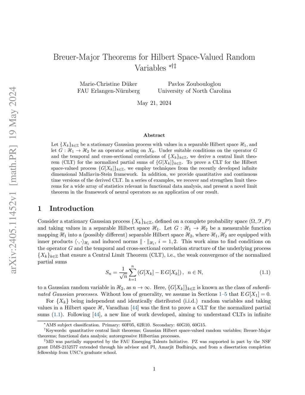 Let be a stationary Gaussian process with values in a separable Hilbert space , and let be an operator acting on . Under suitable conditions on the operator and the temporal and cross-sectional correlations of , we derive a central limit theorem (CLT) for the normalized partial sums of . To prove a CLT for the Hilbert space-valued process , we employ techniques from the recently developed infinite dimensional Malliavin-Stein framework. In addition, we provide quantitative and continuous time versions of the derived CLT. In a series of examples, we recover and strengthen limit theorems for a wide array of statistics relevant in functional data analysis, and present a novel limit theorem in the framework of neural operators as an application of our result.