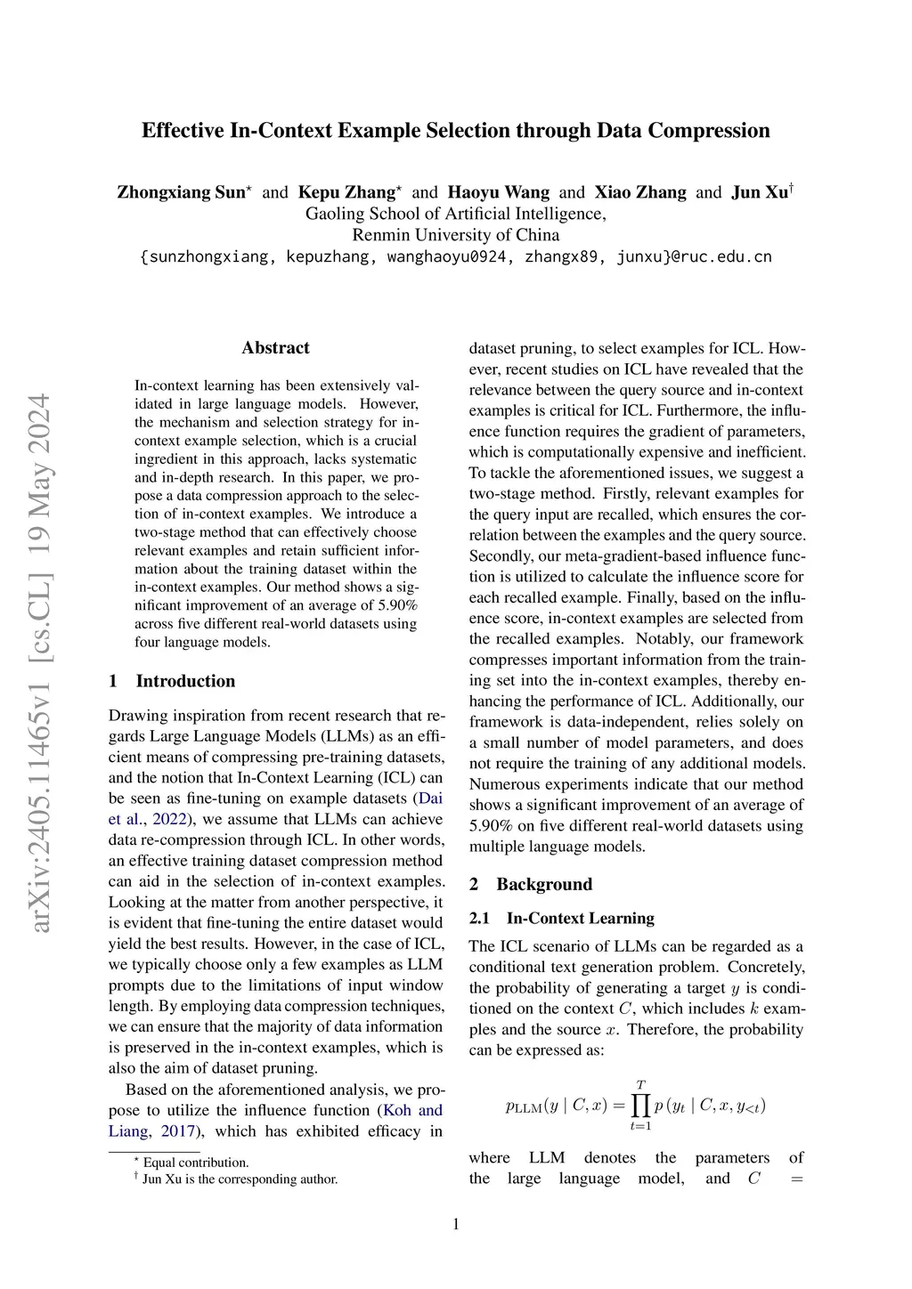 In-context learning has been extensively validated in large language models. However, the mechanism and selection strategy for in-context example selection, which is a crucial ingredient in this approach, lacks systematic and in-depth research. In this paper, we propose a data compression approach to the selection of in-context examples. We introduce a two-stage method that can effectively choose relevant examples and retain sufficient information about the training dataset within the in-context examples. Our method shows a significant improvement of an average of 5.90% across five different real-world datasets using four language models.