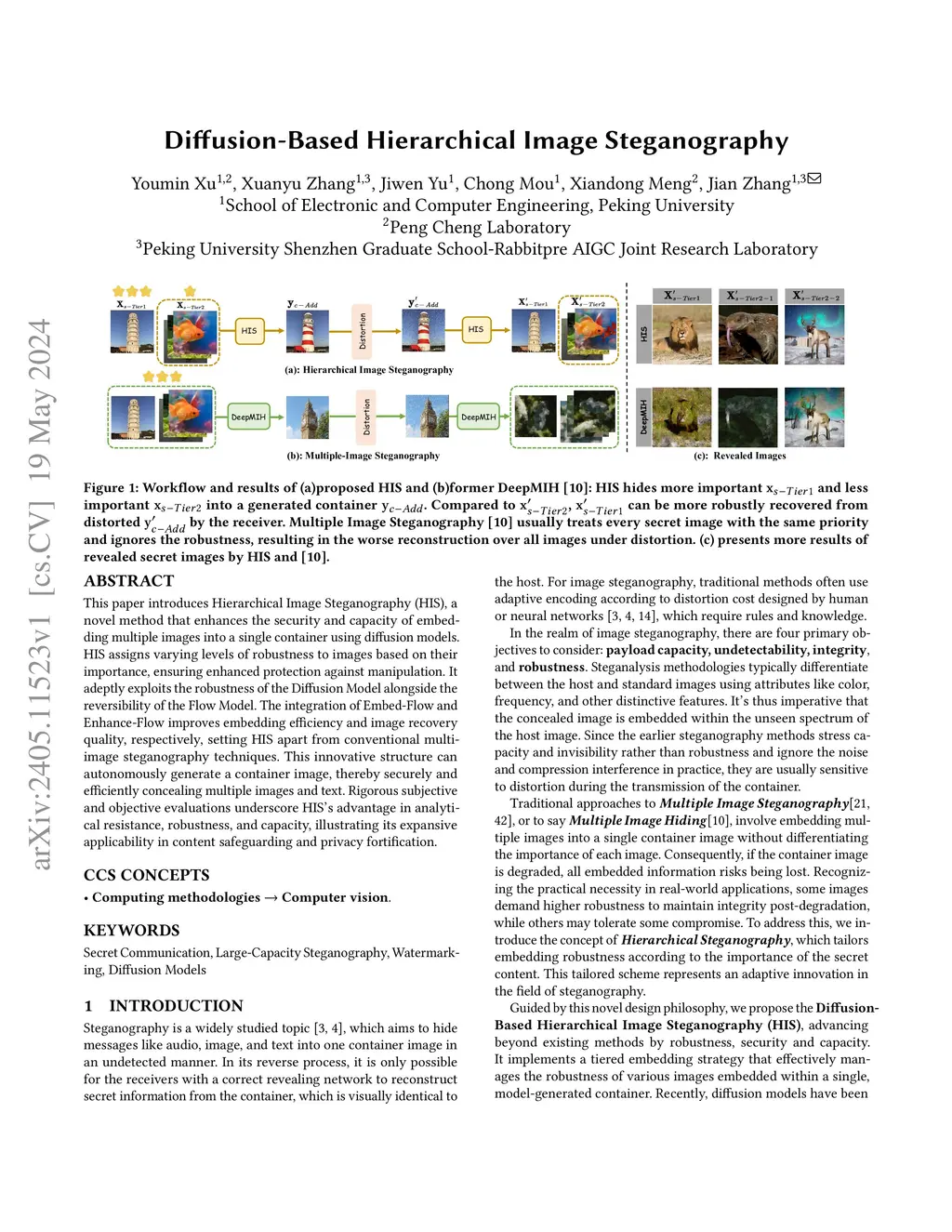 This paper introduces Hierarchical Image Steganography, a novel method that enhances the security and capacity of embedding multiple images into a single container using diffusion models. HIS assigns varying levels of robustness to images based on their importance, ensuring enhanced protection against manipulation. It adaptively exploits the robustness of the Diffusion Model alongside the reversibility of the Flow Model. The integration of Embed-Flow and Enhance-Flow improves embedding efficiency and image recovery quality, respectively, setting HIS apart from conventional multi-image steganography techniques. This innovative structure can autonomously generate a container image, thereby securely and efficiently concealing multiple images and text. Rigorous subjective and objective evaluations underscore our advantage in analytical resistance, robustness, and capacity, illustrating its expansive applicability in content safeguarding and privacy fortification.