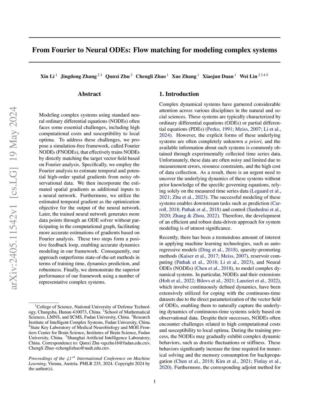 Modeling complex systems using standard neural ordinary differential equations (NODEs) often faces some essential challenges, including high computational costs and susceptibility to local optima. To address these challenges, we propose a simulation-free framework, called Fourier NODEs (FNODEs), that effectively trains NODEs by directly matching the target vector field based on Fourier analysis. Specifically, we employ the Fourier analysis to estimate temporal and potential high-order spatial gradients from noisy observational data. We then incorporate the estimated spatial gradients as additional inputs to a neural network. Furthermore, we utilize the estimated temporal gradient as the optimization objective for the output of the neural network. Later, the trained neural network generates more data points through an ODE solver without participating in the computational graph, facilitating more accurate estimations of gradients based on Fourier analysis. These two steps form a positive feedback loop, enabling accurate dynamics modeling in our framework. Consequently, our approach outperforms state-of-the-art methods in terms of training time, dynamics prediction, and robustness. Finally, we demonstrate the superior performance of our framework using a number of representative complex systems.