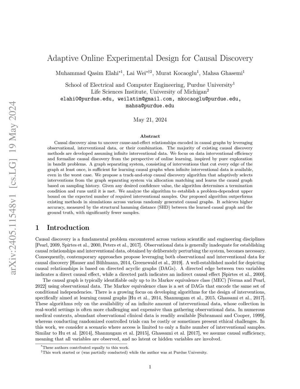 Causal discovery aims to uncover cause-and-effect relationships encoded in causal graphs by leveraging observational, interventional data, or their combination. The majority of existing causal discovery methods are developed assuming infinite interventional data. We focus on data interventional efficiency and formalize causal discovery from the perspective of online learning, inspired by pure exploration in bandit problems. A graph separating system, consisting of interventions that cut every edge of the graph at least once, is sufficient for learning causal graphs when infinite interventional data is available, even in the worst case. We propose a track-and-stop causal discovery algorithm that adaptively selects interventions from the graph separating system via allocation matching and learns the causal graph based on sampling history. Given any desired confidence value, the algorithm determines a termination condition and runs until it is met. We analyze the algorithm to establish a problem-dependent upper bound on the expected number of required interventional samples. Our proposed algorithm outperforms existing methods in simulations across various randomly generated causal graphs. It achieves higher accuracy, measured by the structural hamming distance (SHD) between the learned causal graph and the ground truth, with significantly fewer samples.