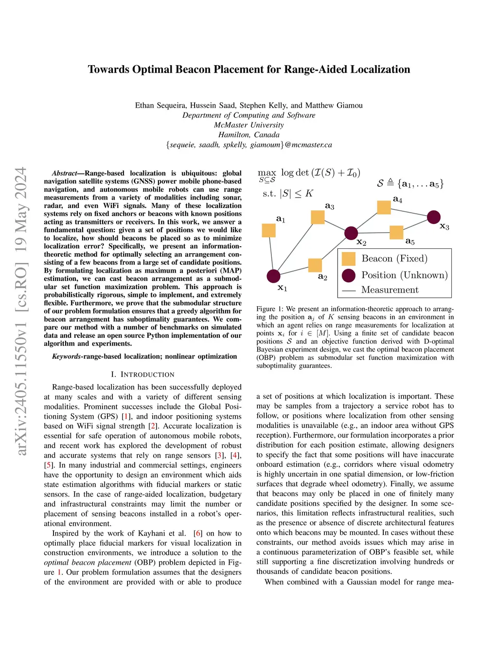 Range-based localization is ubiquitous: global navigation satellite systems (GNSS) power mobile phone-based navigation, and autonomous mobile robots can use range measurements from a variety of modalities including sonar, radar, and even WiFi signals. Many of these localization systems rely on fixed anchors or beacons with known positions acting as transmitters or receivers. In this work, we answer a fundamental question: given a set of positions we would like to localize, how should beacons be placed so as to minimize localization error? Specifically, we present an information theoretic method for optimally selecting an arrangement consisting of a few beacons from a large set of candidate positions. By formulating localization as maximum a posteriori (MAP) estimation, we can cast beacon arrangement as a submodular set function maximization problem. This approach is probabilistically rigorous, simple to implement, and extremely flexible. Furthermore, we prove that the submodular structure of our problem formulation ensures that a greedy algorithm for beacon arrangement has suboptimality guarantees. We compare our method with a number of benchmarks on simulated data and release an open source Python implementation of our algorithm and experiments.