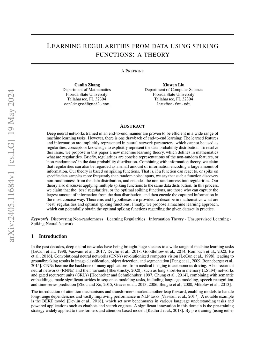 Deep neural networks trained in an end-to-end manner are proven to be efficient in a wide range of machine learning tasks. However, there is one drawback of end-to-end learning: The learned features and information are implicitly represented in neural network parameters, which cannot be used as regularities, concepts or knowledge to explicitly represent the data probability distribution. To resolve this issue, we propose in this paper a new machine learning theory, which defines in mathematics what are regularities. Briefly, regularities are concise representations of the non-random features, or ñon-randomness' in the data probability distribution. Combining this with information theory, we claim that regularities can also be regarded as a small amount of information encoding a large amount of information. Our theory is based on spiking functions. That is, if a function can react to, or spike on specific data samples more frequently than random noise inputs, we say that such a function discovers non-randomness from the data distribution. Also, we say that the discovered non-randomness is encoded into regularities if the function is simple enough. Our theory also discusses applying multiple spiking functions to the same data distribution. In this process, we claim that the 'best' regularities, or the optimal spiking functions, are those who can capture the largest amount of information from the data distribution, and then encode the captured information in the most concise way. Theorems and hypotheses are provided to describe in mathematics what are 'best' regularities and optimal spiking functions. Finally, we propose a machine learning approach, which can potentially obtain the optimal spiking functions regarding the given dataset in practice.