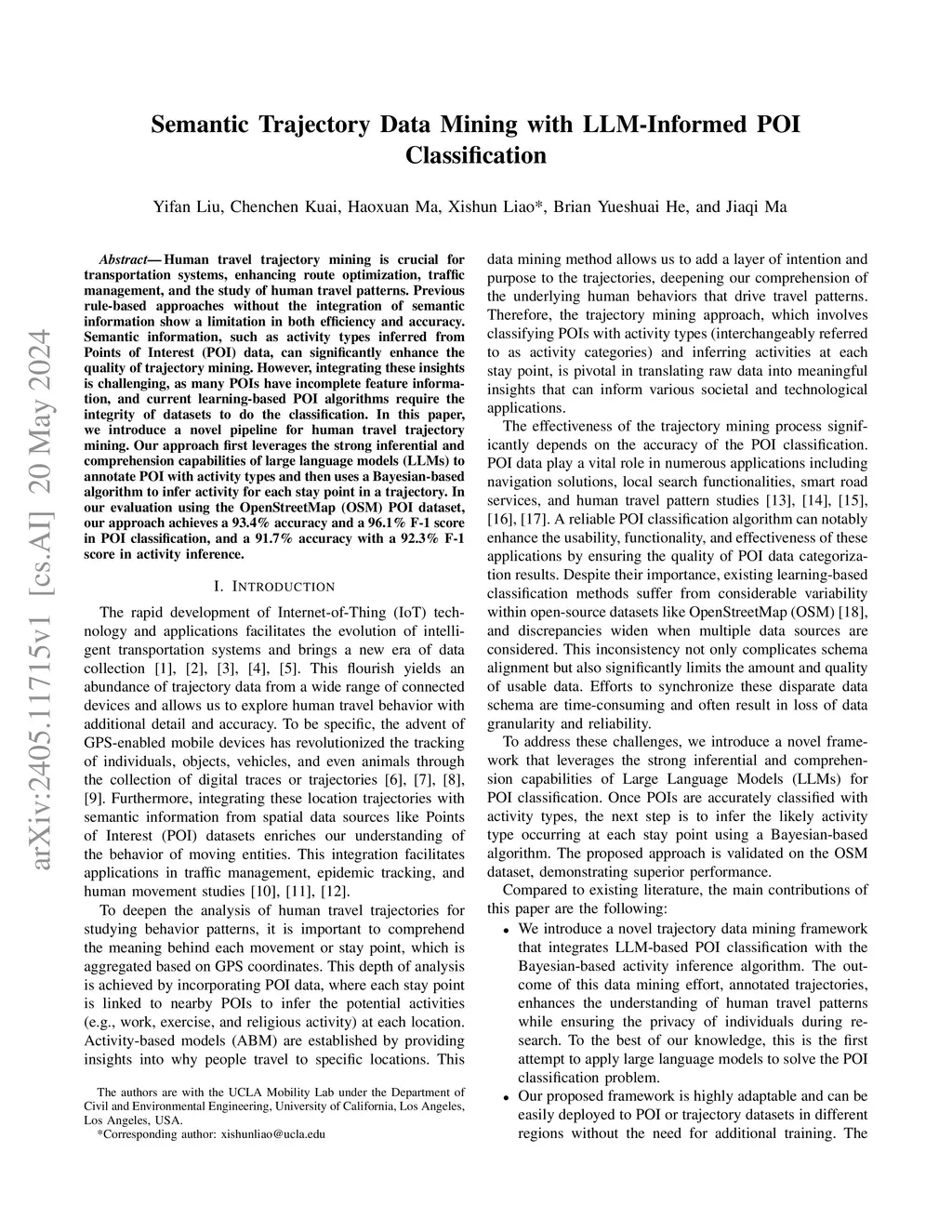Human travel trajectory mining is crucial for transportation systems, enhancing route optimization, traffic management, and the study of human travel patterns. Previous rule-based approaches without the integration of semantic information show a limitation in both efficiency and accuracy. Semantic information, such as activity types inferred from Points of Interest (POI) data, can significantly enhance the quality of trajectory mining. However, integrating these insights is challenging, as many POIs have incomplete feature information, and current learning-based POI algorithms require the integrity of datasets to do the classification. In this paper, we introduce a novel pipeline for human travel trajectory mining. Our approach first leverages the strong inferential and comprehension capabilities of large language models (LLMs) to annotate POI with activity types and then uses a Bayesian-based algorithm to infer activity for each stay point in a trajectory. In our evaluation using the OpenStreetMap (OSM) POI dataset, our approach achieves a 93.4% accuracy and a 96.1% F-1 score in POI classification, and a 91.7% accuracy with a 92.3% F-1 score in activity inference.