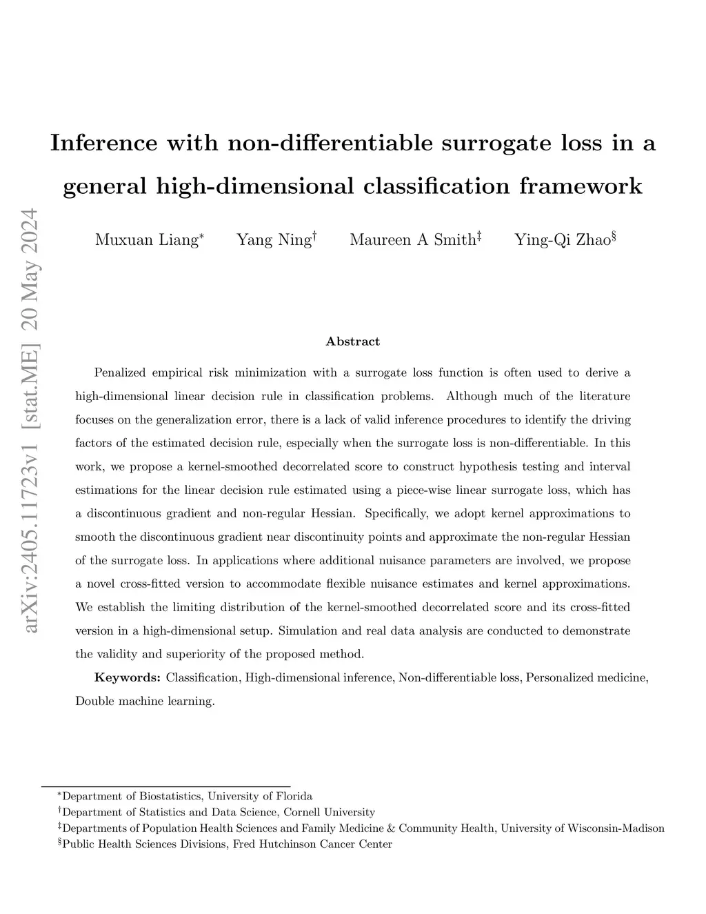 Penalized empirical risk minimization with a surrogate loss function is often used to derive a high-dimensional linear decision rule in classification problems. Although much of the literature focuses on the generalization error, there is a lack of valid inference procedures to identify the driving factors of the estimated decision rule, especially when the surrogate loss is non-differentiable. In this work, we propose a kernel-smoothed decorrelated score to construct hypothesis testing and interval estimations for the linear decision rule estimated using a piece-wise linear surrogate loss, which has a discontinuous gradient and non-regular Hessian. Specifically, we adopt kernel approximations to smooth the discontinuous gradient near discontinuity points and approximate the non-regular Hessian of the surrogate loss. In applications where additional nuisance parameters are involved, we propose a novel cross-fitted version to accommodate flexible nuisance estimates and kernel approximations. We establish the limiting distribution of the kernel-smoothed decorrelated score and its cross-fitted version in a high-dimensional setup. Simulation and real data analysis are conducted to demonstrate the validity and superiority of the proposed method.