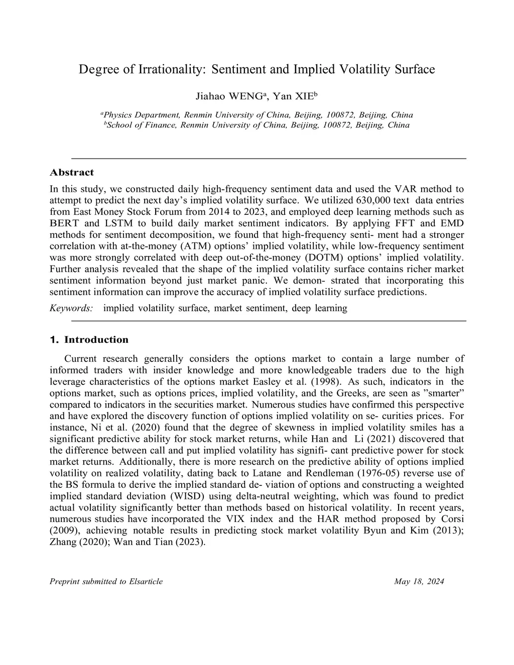 In this study, we constructed daily high-frequency sentiment data and used the VAR method to attempt to predict the next day's implied volatility surface. We utilized 630,000 text data entries from the East Money Stock Forum from 2014 to 2023 and employed deep learning methods such as BERT and LSTM to build daily market sentiment indicators. By applying FFT and EMD methods for sentiment decomposition, we found that high-frequency sentiment had a stronger correlation with at-the-money (ATM) options' implied volatility, while low-frequency sentiment was more strongly correlated with deep out-of-the-money (DOTM) options' implied volatility. Further analysis revealed that the shape of the implied volatility surface contains richer market sentiment information beyond just market panic. We demonstrated that incorporating this sentiment information can improve the accuracy of implied volatility surface predictions.