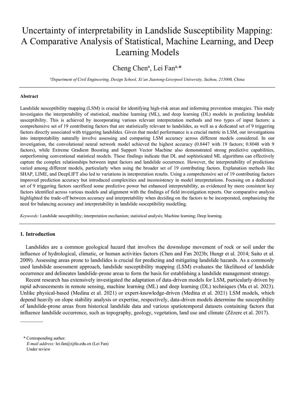 Landslide susceptibility mapping (LSM) is crucial for identifying high-risk areas and informing prevention strategies. This study investigates the interpretability of statistical, machine learning (ML), and deep learning (DL) models in predicting landslide susceptibility. This is achieved by incorporating various relevant interpretation methods and two types of input factors: a comprehensive set of 19 contributing factors that are statistically relevant to landslides, as well as a dedicated set of 9 triggering factors directly associated with triggering landslides. Given that model performance is a crucial metric in LSM, our investigations into interpretability naturally involve assessing and comparing LSM accuracy across different models considered. In our investigation, the convolutional neural network model achieved the highest accuracy (0.8447 with 19 factors; 0.8048 with 9 factors), while Extreme Gradient Boosting and Support Vector Machine also demonstrated strong predictive capabilities, outperforming conventional statistical models. These findings indicate that DL and sophisticated ML algorithms can effectively capture the complex relationships between input factors and landslide occurrence. However, the interpretability of predictions varied among different models, particularly when using the broader set of 19 contributing factors. Explanation methods like SHAP, LIME, and DeepLIFT also led to variations in interpretation results. Using a comprehensive set of 19 contributing factors improved prediction accuracy but introduced complexities and inconsistency in model interpretations. Focusing on a dedicated set of 9 triggering factors sacrificed some predictive power but enhanced interpretability, as evidenced by more consistent key factors identified across various models and alignment with the findings of field investigation reports....