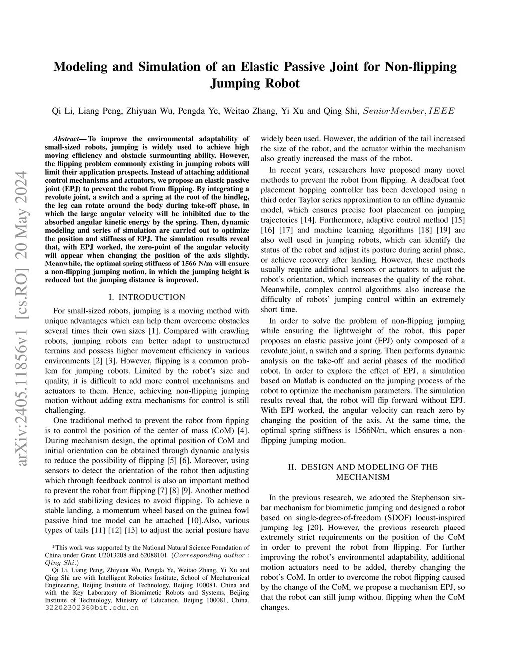 In order to solve the problem of stable jumping of micro robot, we design a special mechanism: elastic passive joint (EPJ). EPJ can assist in achieving smooth jumping through the opening-closing process when the robot jumps. First, we introduce the composition and operation principle of EPJ, and perform a dynamic modeling of the robot's jumping process. Then, in order to verify the effectiveness of EPJ in controlling the robot's smooth jump, we design a simulation experiment based on MATLAB. Through comparative experiments, it was proved that EPJ can greatly adjust the angular velocity of the robot and increase the jump distance of the robot. Finally, we analyze each parameter in EPJ and performs parameter optimization. After optimization, EPJ achieves a completely flip-free jump of the robot, laying an important foundation for improving the mobility of micro-robot.