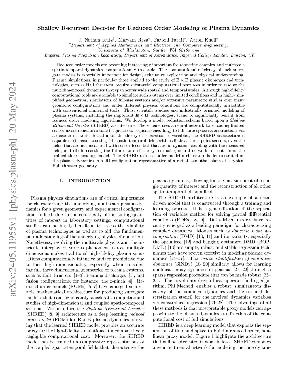 Reduced order models are becoming increasingly important for rendering complex and multiscale spatio-temporal dynamics computationally tractable. The computational efficiency of such surrogate models is especially important for design, exhaustive exploration and physical understanding. Plasma simulations, in particular those applied to the study of plasma discharges and technologies, such as Hall thrusters, require substantial computational resources in order to resolve the multidimentional dynamics that span across wide spatial and temporal scales. Although high-fidelity computational tools are available to simulate such systems over limited conditions and in highly simplified geometries, simulations of full-size systems and/or extensive parametric studies over many geometric configurations and under different physical conditions are computationally intractable with conventional numerical tools. Thus, scientific studies and industrially oriented modeling of plasma systems, including the important technologies, stand to significantly benefit from reduced order modeling algorithms. We develop a model reduction scheme based upon a {\em Shallow REcurrent Decoder} (SHRED) architecture. The scheme uses a neural network for encoding limited sensor measurements in time (sequence-to-sequence encoding) to full state-space reconstructions via a decoder network. Based upon the theory of separation of variables, the SHRED architecture is capable of (i) reconstructing full spatio-temporal fields with as little as three point sensors, even the fields that are not measured with sensor feeds but that are in dynamic coupling with the measured field, and (ii) forecasting the future state of the system using neural network roll-outs from the trained time encoding model.