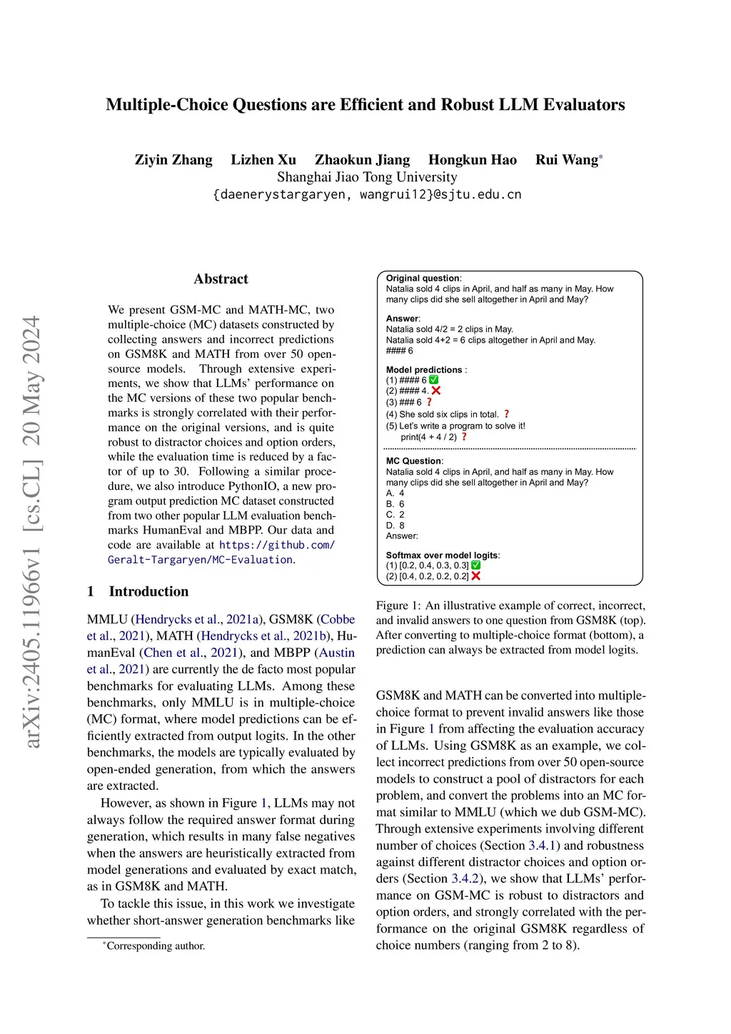 We present GSM-MC, a multiple-choice (MC) dataset constructed by collecting answers and incorrect predictions on GSM8K from 60 open-source models. Through extensive experiments, we show that LLMs' performance on the MC version of this popular benchmark is strongly correlated with their performance on the original version and is quite robust to distractor choices and option orders, while the evaluation time is reduced by a factor of up to 30. Following similar procedures, we introduce MATH-MC, constructed from MATH, and PythonIO, a new program reasoning MC dataset constructed from HumanEval and MBPP. Experimental results indicate that LLMs' performance on these MC benchmarks leaves much room for improvement. Our data and code are available at https://github.com/Geralt-Targaryen/MC-Evaluation.