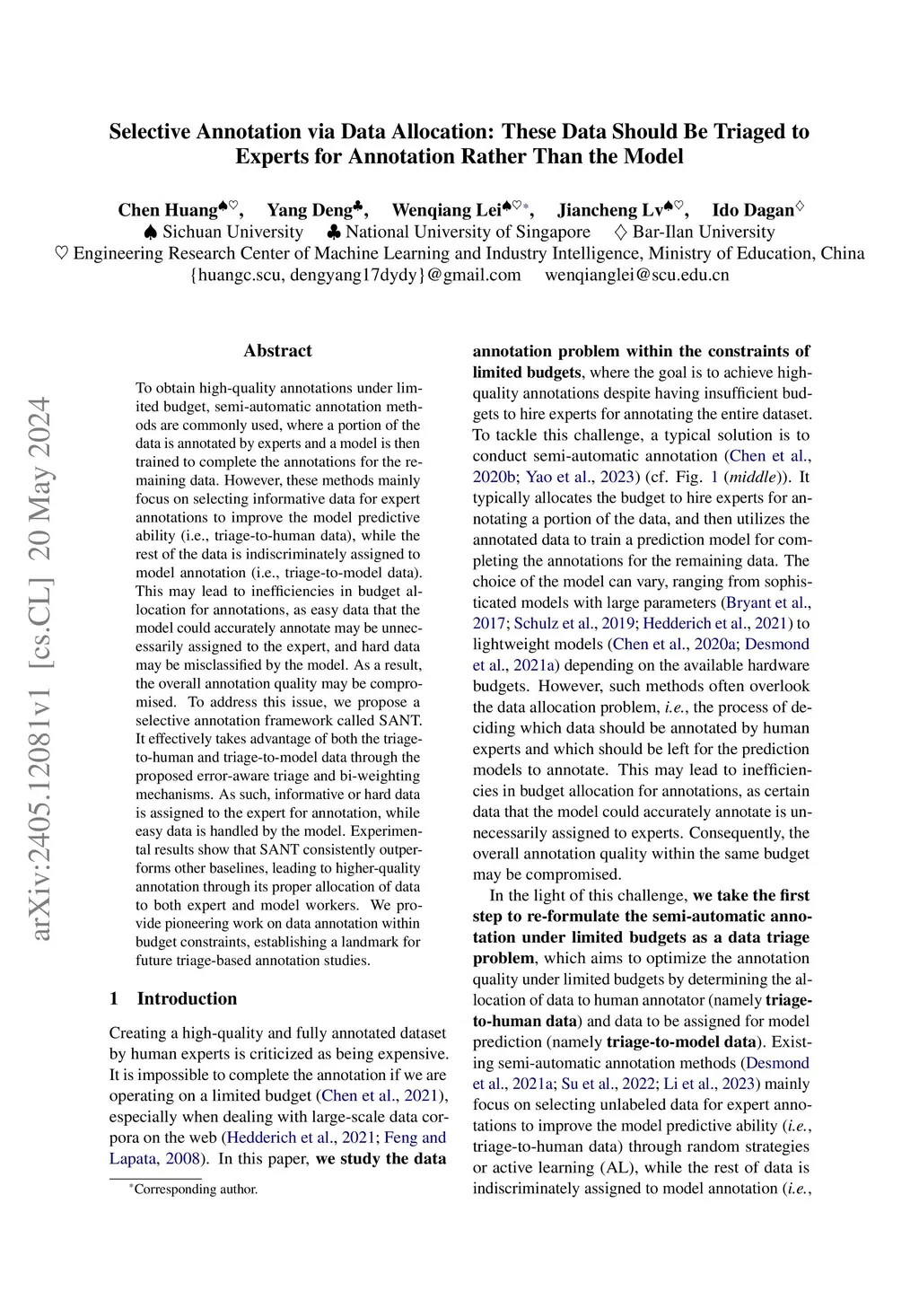 To obtain high-quality annotations under limited budget, semi-automatic annotation methods are commonly used, where a portion of the data is annotated by experts and a model is then trained to complete the annotations for the remaining data. However, these methods mainly focus on selecting informative data for expert annotations to improve the model predictive ability (i.e., triage-to-human data), while the rest of the data is indiscriminately assigned to model annotation (i.e., triage-to-model data). This may lead to inefficiencies in budget allocation for annotations, as easy data that the model could accurately annotate may be unnecessarily assigned to the expert, and hard data may be misclassified by the model. As a result, the overall annotation quality may be compromised. To address this issue, we propose a selective annotation framework called SANT. It effectively takes advantage of both the triage-to-human and triage-to-model data through the proposed error-aware triage and bi-weighting mechanisms. As such, informative or hard data is assigned to the expert for annotation, while easy data is handled by the model. Experimental results show that SANT consistently outperforms other baselines, leading to higher-quality annotation through its proper allocation of data to both expert and model workers. We provide pioneering work on data annotation within budget constraints, establishing a landmark for future triage-based annotation studies.