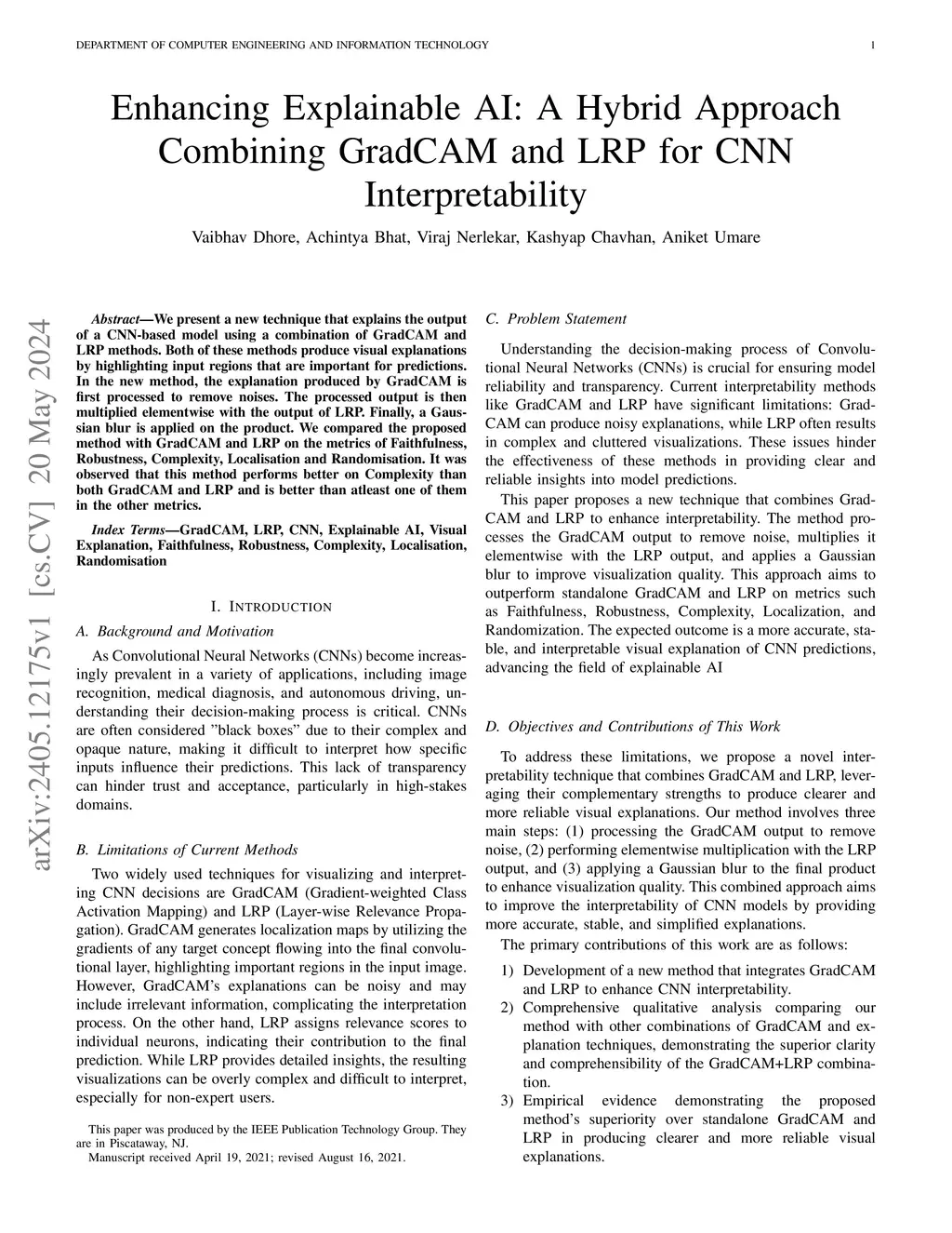 We present a new technique that explains the output of a CNN-based model using a combination of GradCAM and LRP methods. Both of these methods produce visual explanations by highlighting input regions that are important for predictions. In the new method, the explanation produced by GradCAM is first processed to remove noises. The processed output is then multiplied elementwise with the output of LRP. Finally, a Gaussian blur is applied on the product. We compared the proposed method with GradCAM and LRP on the metrics of Faithfulness, Robustness, Complexity, Localisation and Randomisation. It was observed that this method performs better on Complexity than both GradCAM and LRP and is better than atleast one of them in the other metrics.