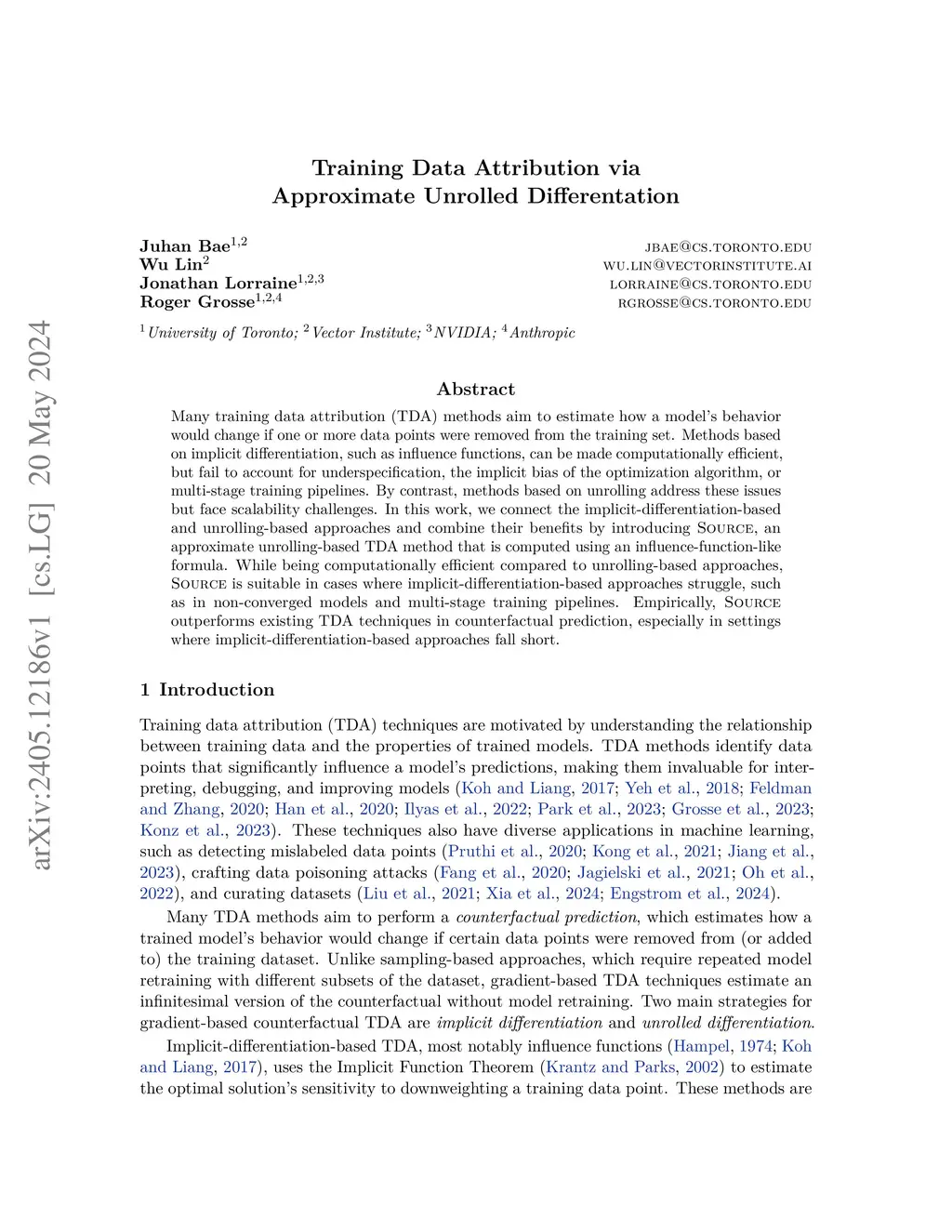 Many training data attribution (TDA) methods aim to estimate how a model's behavior would change if one or more data points were removed from the training set. Methods based on implicit differentiation, such as influence functions, can be made computationally efficient, but fail to account for underspecification, the implicit bias of the optimization algorithm, or multi-stage training pipelines. By contrast, methods based on unrolling address these issues but face scalability challenges. In this work, we connect the implicit-differentiation-based and unrolling-based approaches and combine their benefits by introducing Source, an approximate unrolling-based TDA method that is computed using an influence-function-like formula. While being computationally efficient compared to unrolling-based approaches, Source is suitable in cases where implicit-differentiation-based approaches struggle, such as in non-converged models and multi-stage training pipelines. Empirically, Source outperforms existing TDA techniques in counterfactual prediction, especially in settings where implicit-differentiation-based approaches fall short.