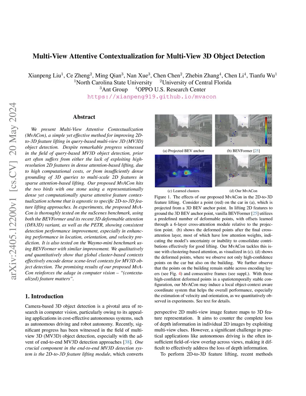 We present Multi-View Attentive Contextualization (MvACon), a simple yet effective method for improving 2D-to-3D feature lifting in query-based multi-view 3D (MV3D) object detection. Despite remarkable progress witnessed in the field of query-based MV3D object detection, prior art often suffers from either the lack of exploiting high-resolution 2D features in dense attention-based lifting, due to high computational costs, or from insufficiently dense grounding of 3D queries to multi-scale 2D features in sparse attention-based lifting. Our proposed MvACon hits the two birds with one stone using a representationally dense yet computationally sparse attentive feature contextualization scheme that is agnostic to specific 2D-to-3D feature lifting approaches. In experiments, the proposed MvACon is thoroughly tested on the nuScenes benchmark, using both the BEVFormer and its recent 3D deformable attention (DFA3D) variant, as well as the PETR, showing consistent detection performance improvement, especially in enhancing performance in location, orientation, and velocity prediction. It is also tested on the Waymo-mini benchmark using BEVFormer with similar improvement. We qualitatively and quantitatively show that global cluster-based contexts effectively encode dense scene-level contexts for MV3D object detection. The promising results of our proposed MvACon reinforces the adage in computer vision -- ``(contextualized) feature matters".