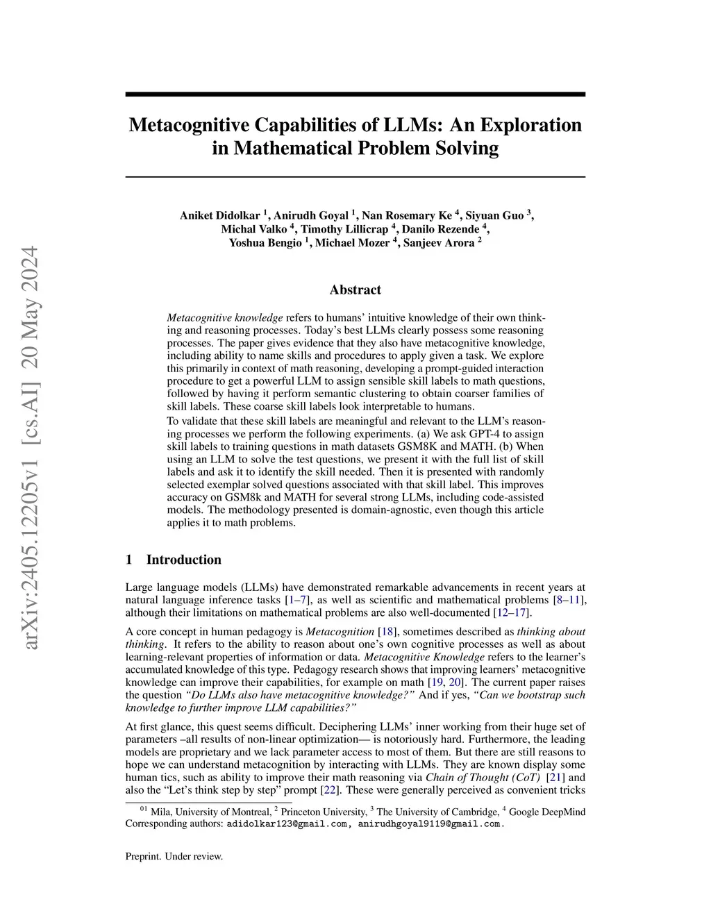 Metacognitive knowledge refers to humans' intuitive knowledge of their own thinking and reasoning processes. Today's best LLMs clearly possess some reasoning processes. The paper gives evidence that they also have metacognitive knowledge, including ability to name skills and procedures to apply given a task. We explore this primarily in context of math reasoning, developing a prompt-guided interaction procedure to get a powerful LLM to assign sensible skill labels to math questions, followed by having it perform semantic clustering to obtain coarser families of skill labels. These coarse skill labels look interpretable to humans. To validate that these skill labels are meaningful and relevant to the LLM's reasoning processes we perform the following experiments. (a) We ask GPT-4 to assign skill labels to training questions in math datasets GSM8K and MATH. (b) When using an LLM to solve the test questions, we present it with the full list of skill labels and ask it to identify the skill needed. Then it is presented with randomly selected exemplar solved questions associated with that skill label. This improves accuracy on GSM8k and MATH for several strong LLMs, including code-assisted models. The methodology presented is domain-agnostic, even though this article applies it to math problems.