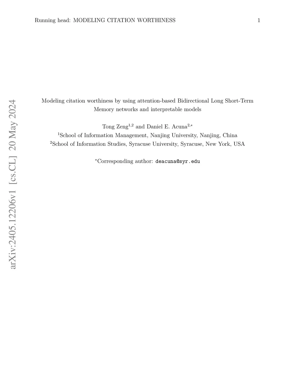 Modeling citation worthiness by using attention-based bidirectional long