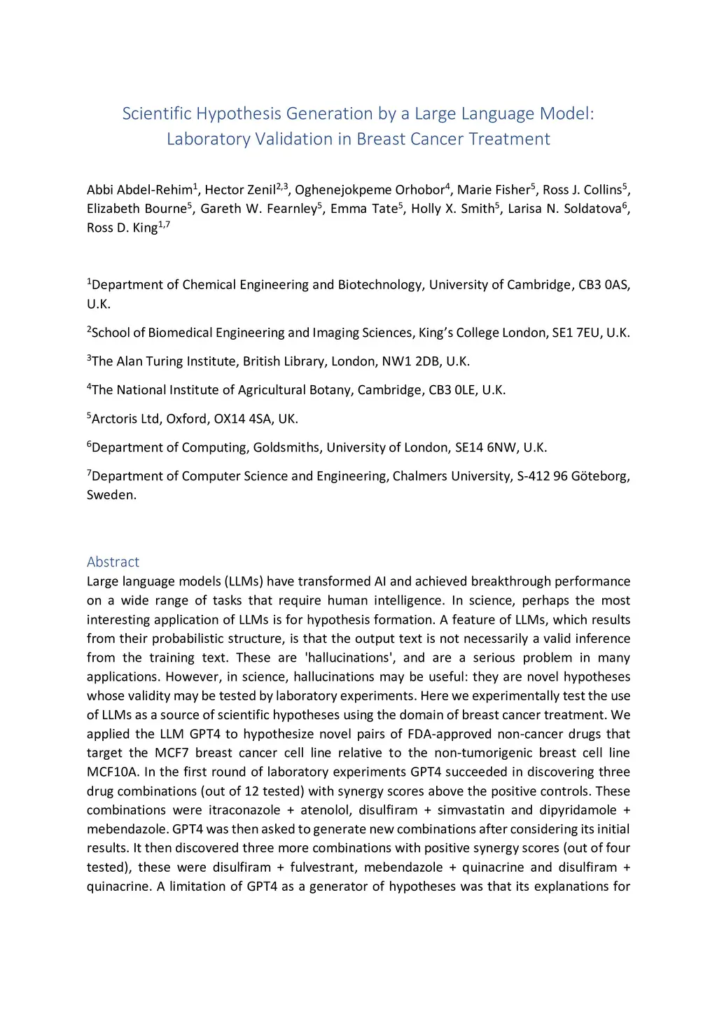 Large language models (LLMs) have transformed AI and achieved breakthrough performance on a wide range of tasks that require human intelligence. In science, perhaps the most interesting application of LLMs is for hypothesis formation. A feature of LLMs, which results from their probabilistic structure, is that the output text is not necessarily a valid inference from the training text. These are 'hallucinations', and are a serious problem in many applications. However, in science, hallucinations may be useful: they are novel hypotheses whose validity may be tested by laboratory experiments. Here we experimentally test the use of LLMs as a source of scientific hypotheses using the domain of breast cancer treatment. We applied the LLM GPT4 to hypothesize novel pairs of FDA-approved non-cancer drugs that target the MCF7 breast cancer cell line relative to the non-tumorigenic breast cell line MCF10A. In the first round of laboratory experiments GPT4 succeeded in discovering three drug combinations (out of 12 tested) with synergy scores above the positive controls. These combinations were itraconazole + atenolol, disulfiram + simvastatin and dipyridamole + mebendazole. GPT4 was then asked to generate new combinations after considering its initial results. It then discovered three more combinations with positive synergy scores (out of four tested), these were disulfiram + fulvestrant, mebendazole + quinacrine and disulfiram + quinacrine. A limitation of GPT4 as a generator of hypotheses was that its explanations for them were formulaic and unconvincing. We conclude that LLMs are an exciting novel source of scientific hypotheses.