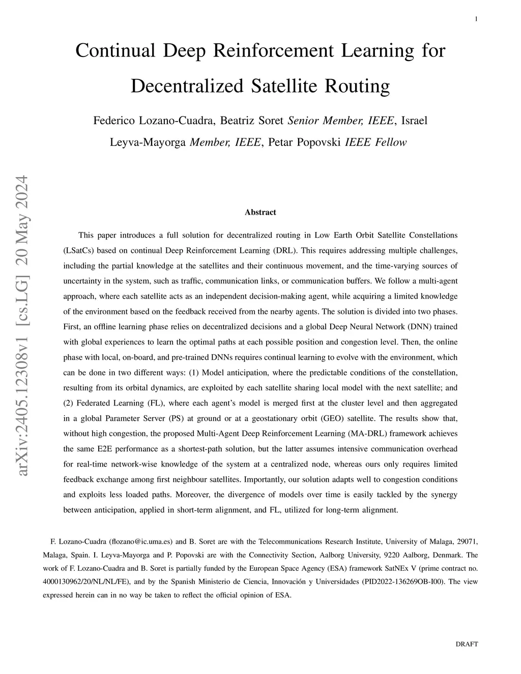 This paper introduces a full solution for decentralized routing in Low Earth Orbit satellite constellations based on continual Deep Reinforcement Learning (DRL). This requires addressing multiple challenges, including the partial knowledge at the satellites and their continuous movement, and the time-varying sources of uncertainty in the system, such as traffic, communication links, or communication buffers. We follow a multi-agent approach, where each satellite acts as an independent decision-making agent, while acquiring a limited knowledge of the environment based on the feedback received from the nearby agents. The solution is divided into two phases. First, an offline learning phase relies on decentralized decisions and a global Deep Neural Network (DNN) trained with global experiences. Then, the online phase with local, on-board, and pre-trained DNNs requires continual learning to evolve with the environment, which can be done in two different ways: (1) Model anticipation, where the predictable conditions of the constellation are exploited by each satellite sharing local model with the next satellite; and (2) Federated Learning (FL), where each agent's model is merged first at the cluster level and then aggregated in a global Parameter Server. The results show that, without high congestion, the proposed Multi-Agent DRL framework achieves the same E2E performance as a shortest-path solution, but the latter assumes intensive communication overhead for real-time network-wise knowledge of the system at a centralized node, whereas ours only requires limited feedback exchange among first neighbour satellites. Importantly, our solution adapts well to congestion conditions and exploits less loaded paths. Moreover, the divergence of models over time is easily tackled by the synergy between anticipation, applied in short-term alignment, and FL, utilized for long-term alignment.