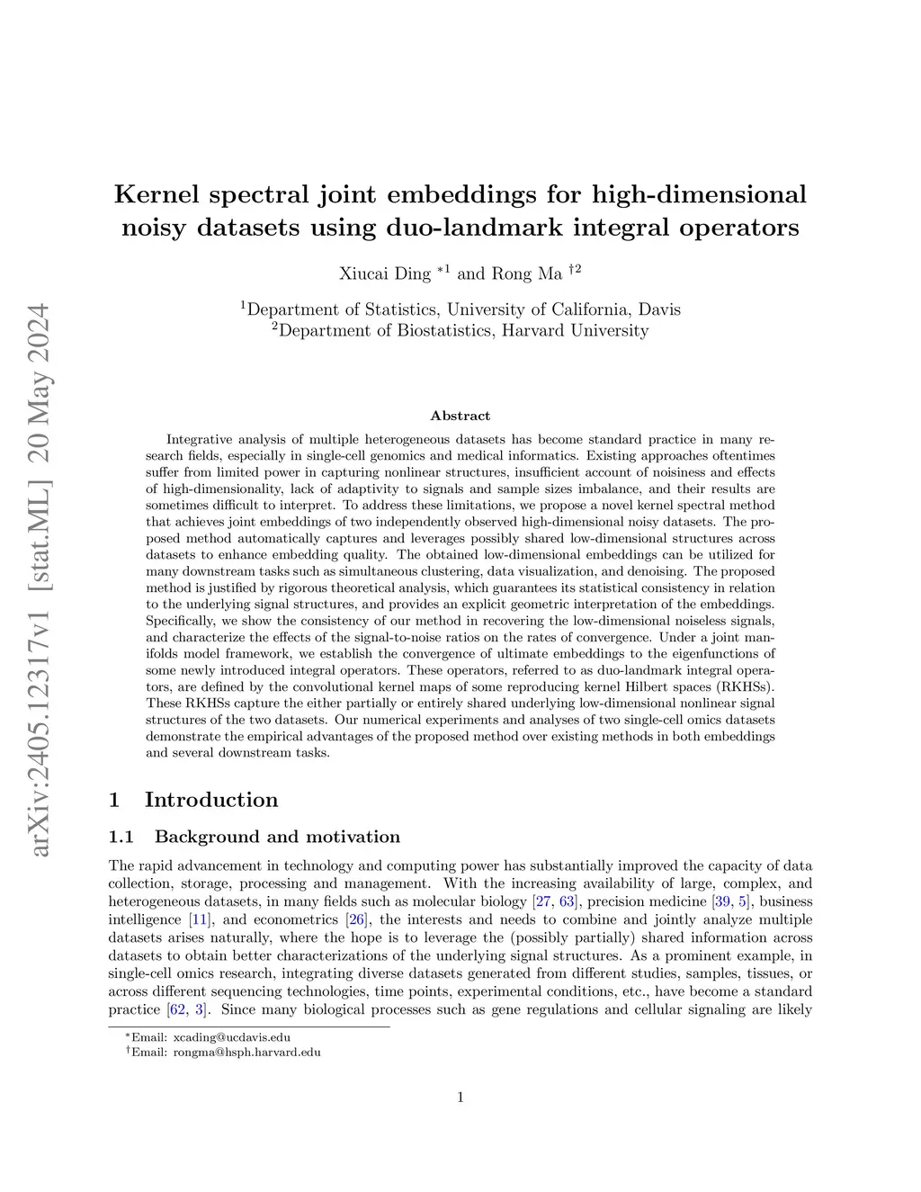 Integrative analysis of multiple heterogeneous datasets has become standard practice in many research fields, especially in single-cell genomics and medical informatics. Existing approaches oftentimes suffer from limited power in capturing nonlinear structures, insufficient account of noisiness and effects of high-dimensionality, lack of adaptivity to signals and sample sizes imbalance, and their results are sometimes difficult to interpret. To address these limitations, we propose a novel kernel spectral method that achieves joint embeddings of two independently observed high-dimensional noisy datasets. The proposed method automatically captures and leverages possibly shared low-dimensional structures across datasets to enhance embedding quality. The obtained low-dimensional embeddings can be utilized for many downstream tasks such as simultaneous clustering, data visualization, and denoising. The proposed method is justified by rigorous theoretical analysis. Specifically, we show the consistency of our method in recovering the low-dimensional noiseless signals, and characterize the effects of the signal-to-noise ratios on the rates of convergence. Under a joint manifolds model framework, we establish the convergence of ultimate embeddings to the eigenfunctions of some newly introduced integral operators. These operators, referred to as duo-landmark integral operators, are defined by the convolutional kernel maps of some reproducing kernel Hilbert spaces (RKHSs). These RKHSs capture the either partially or entirely shared underlying low-dimensional nonlinear signal structures of the two datasets. Our numerical experiments and analyses of two single-cell omics datasets demonstrate the empirical advantages of the proposed method over existing methods in both embeddings and several downstream tasks.