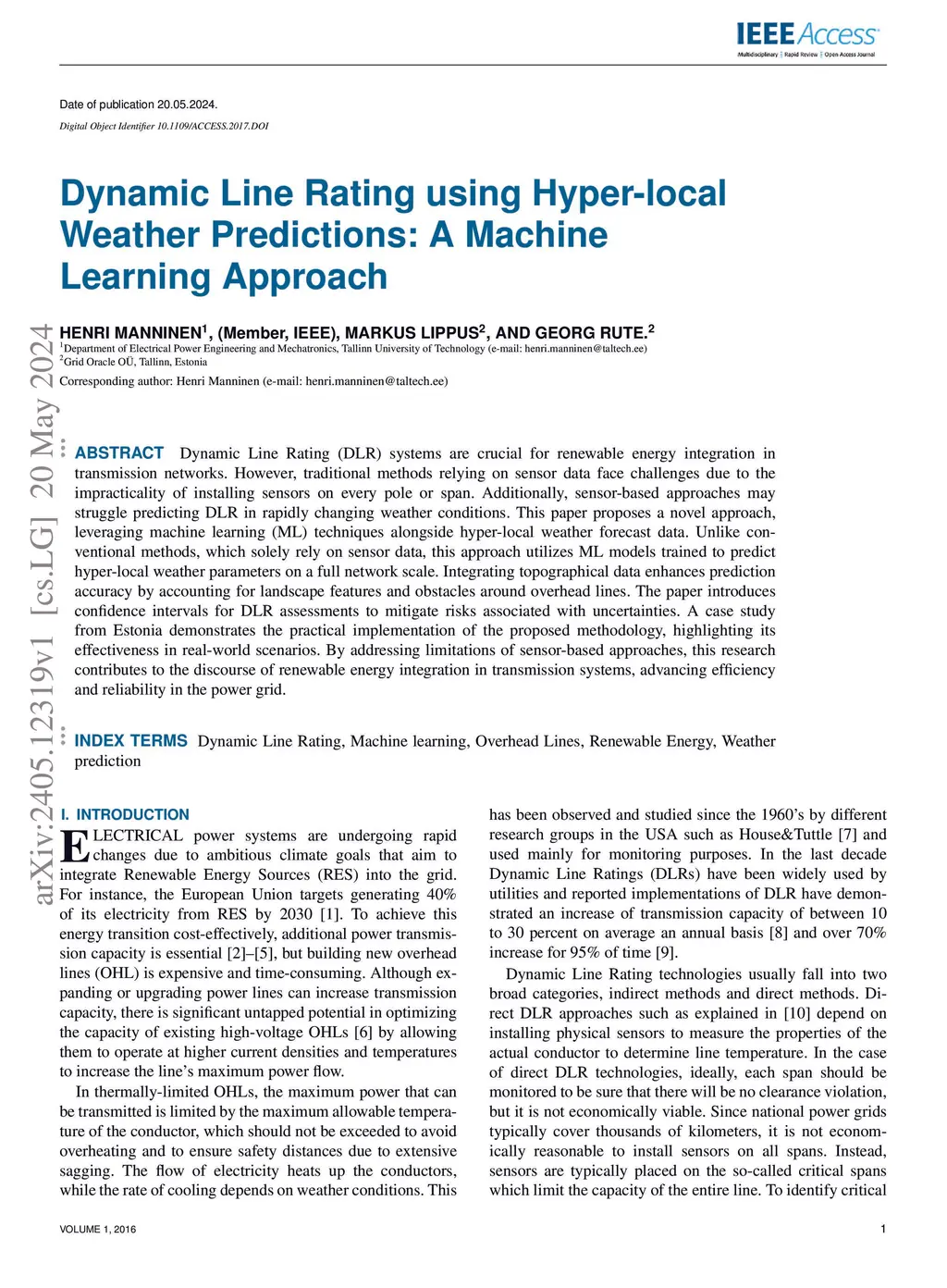 Dynamic Line Rating (DLR) systems are crucial for renewable energy integration in transmission networks. However, traditional methods relying on sensor data face challenges due to the impracticality of installing sensors on every pole or span. Additionally, sensor-based approaches may struggle predicting DLR in rapidly changing weather conditions. This paper proposes a novel approach, leveraging machine learning (ML) techniques alongside hyper-local weather forecast data. Unlike conventional methods, which solely rely on sensor data, this approach utilizes ML models trained to predict hyper-local weather parameters on a full network scale. Integrating topographical data enhances prediction accuracy by accounting for landscape features and obstacles around overhead lines. The paper introduces confidence intervals for DLR assessments to mitigate risks associated with uncertainties. A case study from Estonia demonstrates the practical implementation of the proposed methodology, highlighting its effectiveness in real-world scenarios. By addressing limitations of sensor-based approaches, this research contributes to the discourse of renewable energy integration in transmission systems, advancing efficiency and reliability in the power grid.