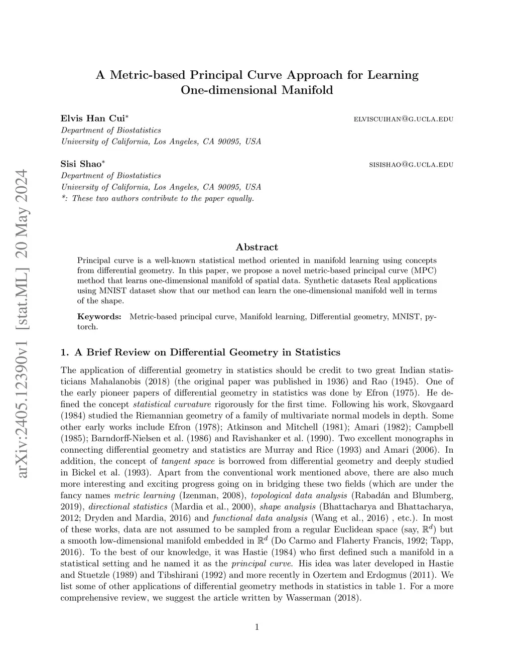 Principal curve is a well-known statistical method oriented in manifold learning using concepts from differential geometry. In this paper, we propose a novel metric-based principal curve (MPC) method that learns one-dimensional manifold of spatial data. Synthetic datasets Real applications using MNIST dataset show that our method can learn the one-dimensional manifold well in terms of the shape.