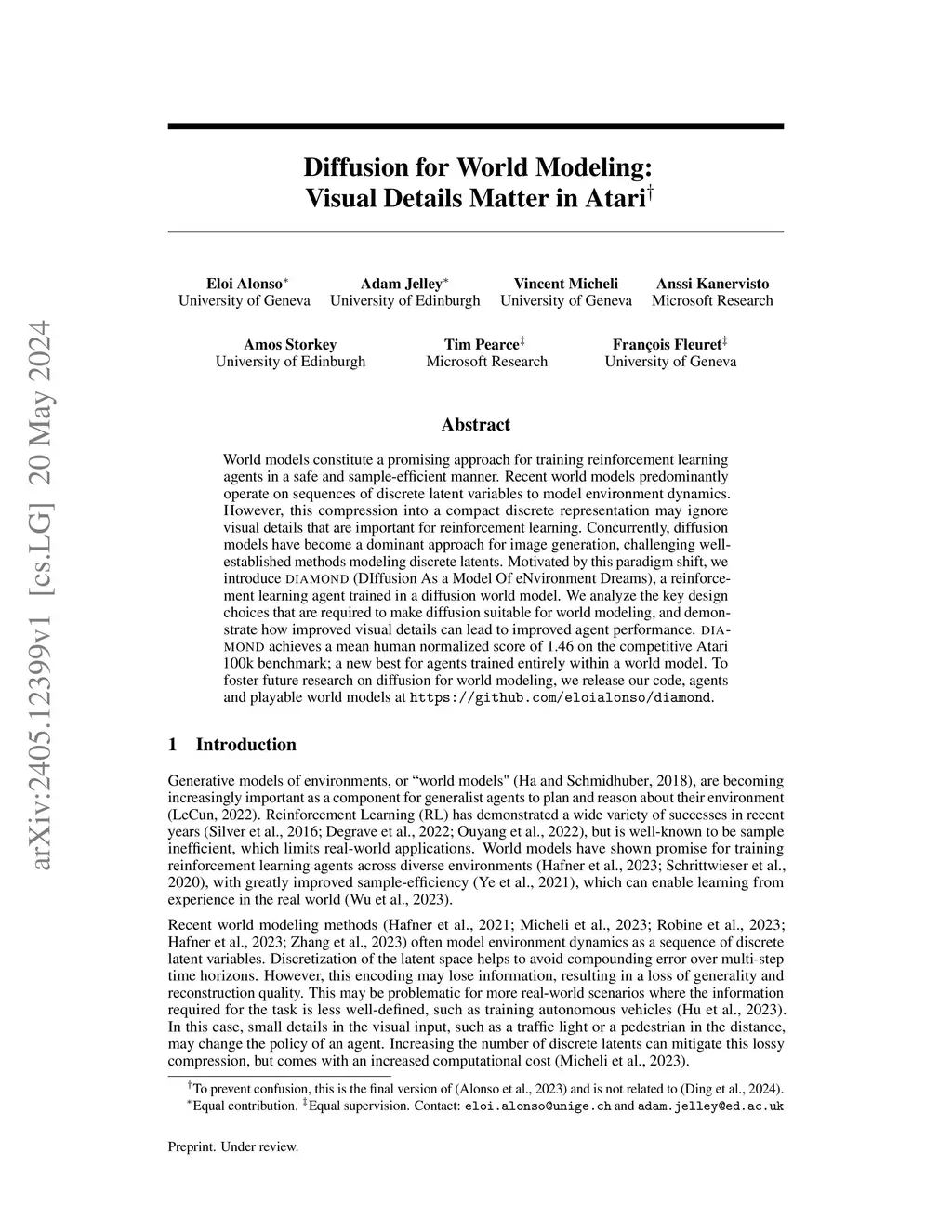 World models constitute a promising approach for training reinforcement learning agents in a safe and sample-efficient manner. Recent world models predominantly operate on sequences of discrete latent variables to model environment dynamics. However, this compression into a compact discrete representation may ignore visual details that are important for reinforcement learning. Concurrently, diffusion models have become a dominant approach for image generation, challenging well-established methods modeling discrete latents. Motivated by this paradigm shift, we introduce DIAMOND (DIffusion As a Model Of eNvironment Dreams), a reinforcement learning agent trained in a diffusion world model. We analyze the key design choices that are required to make diffusion suitable for world modeling, and demonstrate how improved visual details can lead to improved agent performance. DIAMOND achieves a mean human normalized score of 1.46 on the competitive Atari 100k benchmark; a new best for agents trained entirely within a world model. To foster future research on diffusion for world modeling, we release our code, agents and playable world models at https://github.com/eloialonso/diamond.