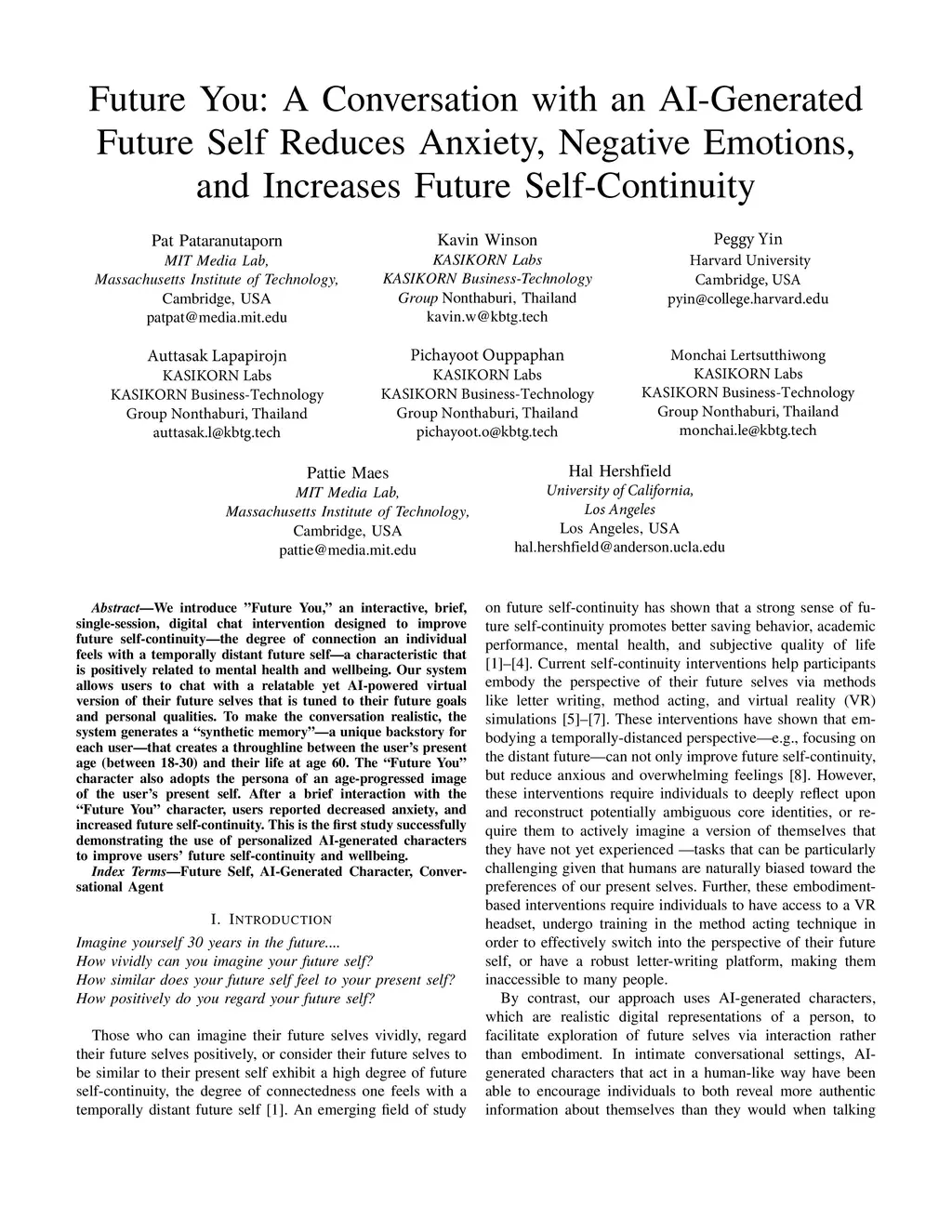 We introduce "Future You," an interactive, brief, single-session, digital chat intervention designed to improve future self-continuity--the degree of connection an individual feels with a temporally distant future self--a characteristic that is positively related to mental health and wellbeing. Our system allows users to chat with a relatable yet AI-powered virtual version of their future selves that is tuned to their future goals and personal qualities. To make the conversation realistic, the system generates a "synthetic memory"--a unique backstory for each user--that creates a throughline between the user's present age (between 18-30) and their life at age 60. The "Future You" character also adopts the persona of an age-progressed image of the user's present self. After a brief interaction with the "Future You" character, users reported decreased anxiety, and increased future self-continuity. This is the first study successfully demonstrating the use of personalized AI-generated characters to improve users' future self-continuity and wellbeing.