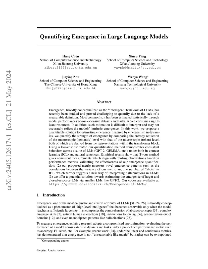 Emergence, broadly conceptualized as the ``intelligent'' behaviors of LLMs, has recently been studied and proved challenging to quantify due to the lack of a measurable definition. Most commonly, it has been estimated statistically through model performances across extensive datasets and tasks, which consumes significant resources. In addition, such estimation is difficult to interpret and may not accurately reflect the models' intrinsic emergence. In this work, we propose a quantifiable solution for estimating emergence. Inspired by emergentism in dynamics, we quantify the strength of emergence by comparing the entropy reduction of the macroscopic (semantic) level with that of the microscopic (token) level, both of which are derived from the representations within the transformer block. Using a low-cost estimator, our quantification method demonstrates consistent behaviors across a suite of LMs (GPT-2, GEMMA, etc.) under both in-context learning (ICL) and natural sentences. Empirical results show that (1) our method gives consistent measurements which align with existing observations based on performance metrics, validating the effectiveness of our emergence quantification; (2) our proposed metric uncovers novel emergence patterns such as the correlations between the variance of our metric and the number of ``shots'' in ICL, which further suggests a new way of interpreting hallucinations in LLMs; (3) we offer a potential solution towards estimating the emergence of larger and closed-resource LMs via smaller LMs like GPT-2. Our codes are available at: https://github.com/Zodiark-ch/Emergence-of-LLMs/.