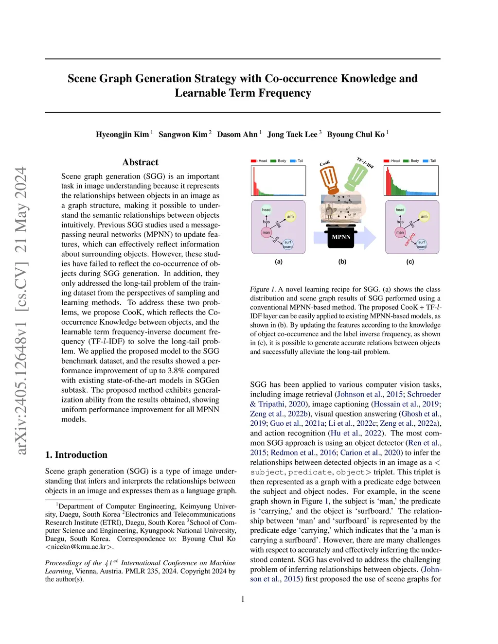 Scene graph generation (SGG) is an important task in image understanding because it represents the relationships between objects in an image as a graph structure, making it possible to understand the semantic relationships between objects intuitively. Previous SGG studies used a message-passing neural networks (MPNN) to update features, which can effectively reflect information about surrounding objects. However, these studies have failed to reflect the co-occurrence of objects during SGG generation. In addition, they only addressed the long-tail problem of the training dataset from the perspectives of sampling and learning methods. To address these two problems, we propose CooK, which reflects the Co-occurrence Knowledge between objects, and the learnable term frequency-inverse document frequency (TF-l-IDF) to solve the long-tail problem. We applied the proposed model to the SGG benchmark dataset, and the results showed a performance improvement of up to 3.8% compared with existing state-of-the-art models in SGGen subtask. The proposed method exhibits generalization ability from the results obtained, showing uniform performance improvement for all MPNN models.