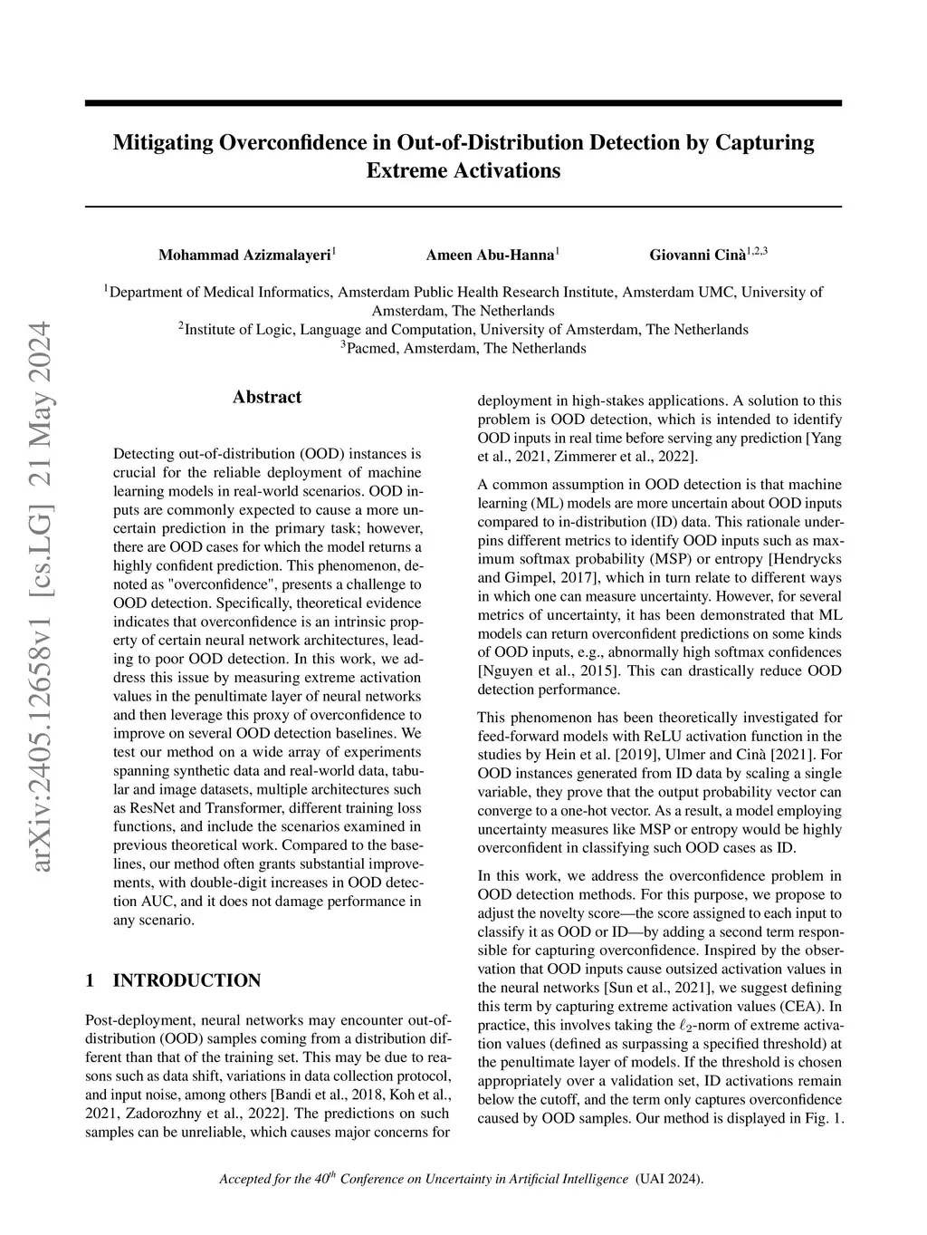 Detecting out-of-distribution (OOD) instances is crucial for the reliable deployment of machine learning models in real-world scenarios. OOD inputs are commonly expected to cause a more uncertain prediction in the primary task; however, there are OOD cases for which the model returns a highly confident prediction. This phenomenon, denoted as "overconfidence", presents a challenge to OOD detection. Specifically, theoretical evidence indicates that overconfidence is an intrinsic property of certain neural network architectures, leading to poor OOD detection. In this work, we address this issue by measuring extreme activation values in the penultimate layer of neural networks and then leverage this proxy of overconfidence to improve on several OOD detection baselines. We test our method on a wide array of experiments spanning synthetic data and real-world data, tabular and image datasets, multiple architectures such as ResNet and Transformer, different training loss functions, and include the scenarios examined in previous theoretical work. Compared to the baselines, our method often grants substantial improvements, with double-digit increases in OOD detection AUC, and it does not damage performance in any scenario.