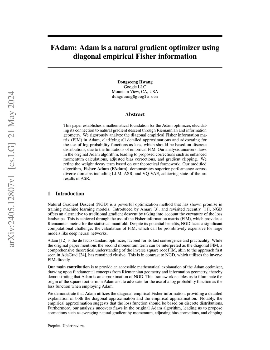 This paper establishes a mathematical foundation for the Adam optimizer, elucidating its connection to natural gradient descent through Riemannian and information geometry. We provide an accessible and detailed analysis of the diagonal empirical Fisher information matrix (FIM) in Adam, clarifying all detailed approximations and advocating for the use of log probability functions as loss, which should be based on discrete distributions, due to the limitations of empirical FIM. Our analysis uncovers flaws in the original Adam algorithm, leading to proposed corrections such as enhanced momentum calculations, adjusted bias corrections, adaptive epsilon, and gradient clipping. We refine the weight decay term based on our theoretical framework. Our modified algorithm, Fisher Adam (FAdam), demonstrates superior performance across diverse domains including LLM, ASR, and VQ-VAE, achieving state-of-the-art results in ASR.