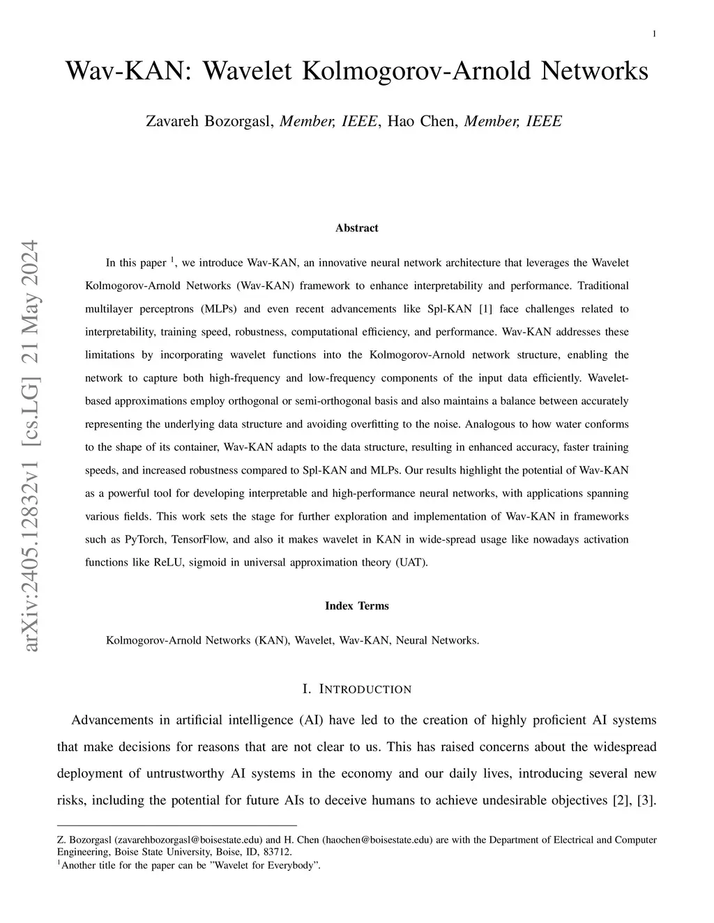 In this paper, we introduce Wav-KAN, an innovative neural network architecture that leverages the Wavelet Kolmogorov-Arnold Networks (Wav-KAN) framework to enhance interpretability and performance. Traditional multilayer perceptrons (MLPs) and even recent advancements like Spl-KAN face challenges related to interpretability, training speed, robustness, computational efficiency, and performance. Wav-KAN addresses these limitations by incorporating wavelet functions into the Kolmogorov-Arnold network structure, enabling the network to capture both high-frequency and low-frequency components of the input data efficiently. Wavelet-based approximations employ orthogonal or semi-orthogonal basis and maintain a balance between accurately representing the underlying data structure and avoiding overfitting to the noise. While continuous wavelet transform (CWT) has a lot of potentials, we also employed discrete wavelet transform (DWT) for multiresolution analysis, which obviated the need for recalculation of the previous steps in finding the details. Analogous to how water conforms to the shape of its container, Wav-KAN adapts to the data structure, resulting in enhanced accuracy, faster training speeds, and increased robustness compared to Spl-KAN and MLPs. Our results highlight the potential of Wav-KAN as a powerful tool for developing interpretable and high-performance neural networks, with applications spanning various fields. This work sets the stage for further exploration and implementation of Wav-KAN in frameworks such as PyTorch and TensorFlow, aiming to make wavelets in KAN as widespread as activation functions like ReLU and sigmoid in universal approximation theory (UAT). The codes to replicate the simulations are available at https://github.com/zavareh1/Wav-KAN.