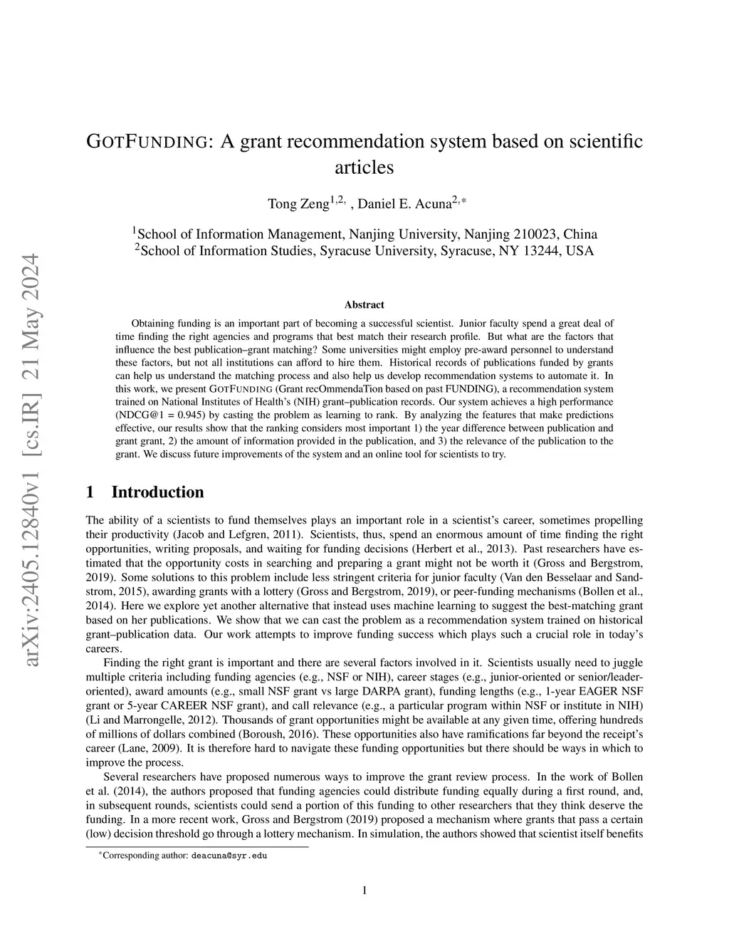 Obtaining funding is an important part of becoming a successful scientist. Junior faculty spend a great deal of time finding the right agencies and programs that best match their research profile. But what are the factors that influence the best publication--grant matching? Some universities might employ pre-award personnel to understand these factors, but not all institutions can afford to hire them. Historical records of publications funded by grants can help us understand the matching process and also help us develop recommendation systems to automate it. In this work, we present \textsc{GotFunding} (Grant recOmmendaTion based on past FUNDING), a recommendation system trained on National Institutes of Health's (NIH) grant--publication records. Our system achieves a high performance (NDCG@1 = 0.945) by casting the problem as learning to rank. By analyzing the features that make predictions effective, our results show that the ranking considers most important 1) the year difference between publication and grant grant, 2) the amount of information provided in the publication, and 3) the relevance of the publication to the grant. We discuss future improvements of the system and an online tool for scientists to try.